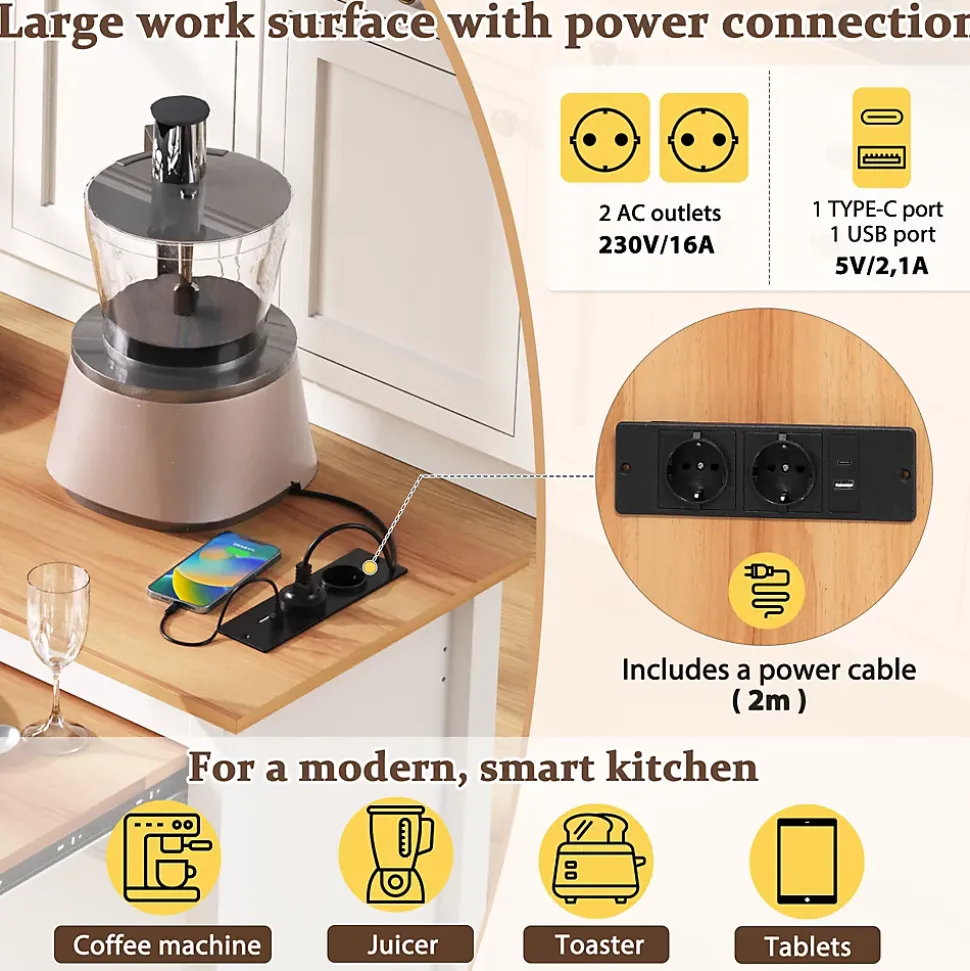 - 【Station de charge intégrée】 Les prises intégrées, USB et Type-C permettent de charger smartphones et appareils électriques directement sur l’îlot, simplifiant l’utilisation quotidienne et évitant les câbles désordonnés.