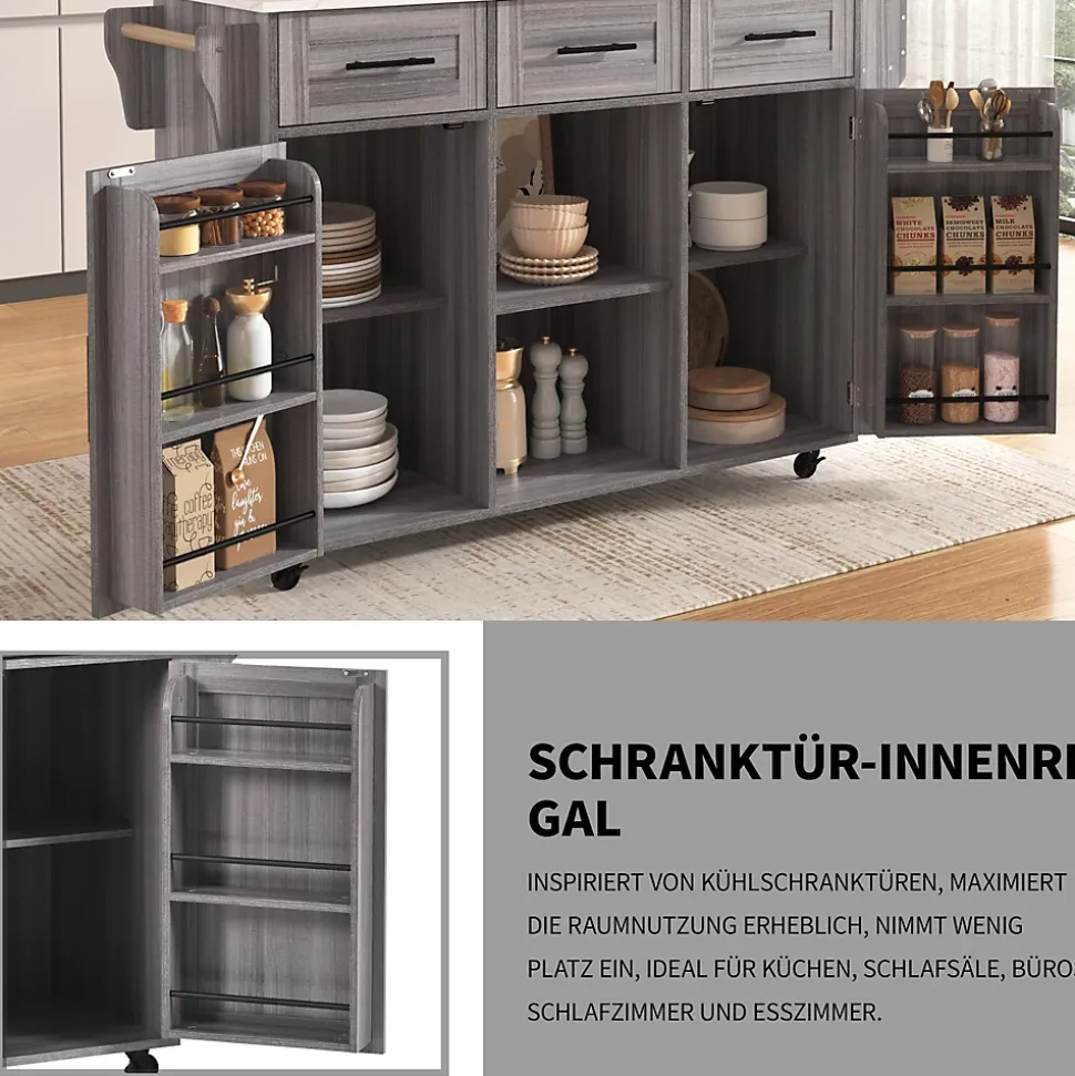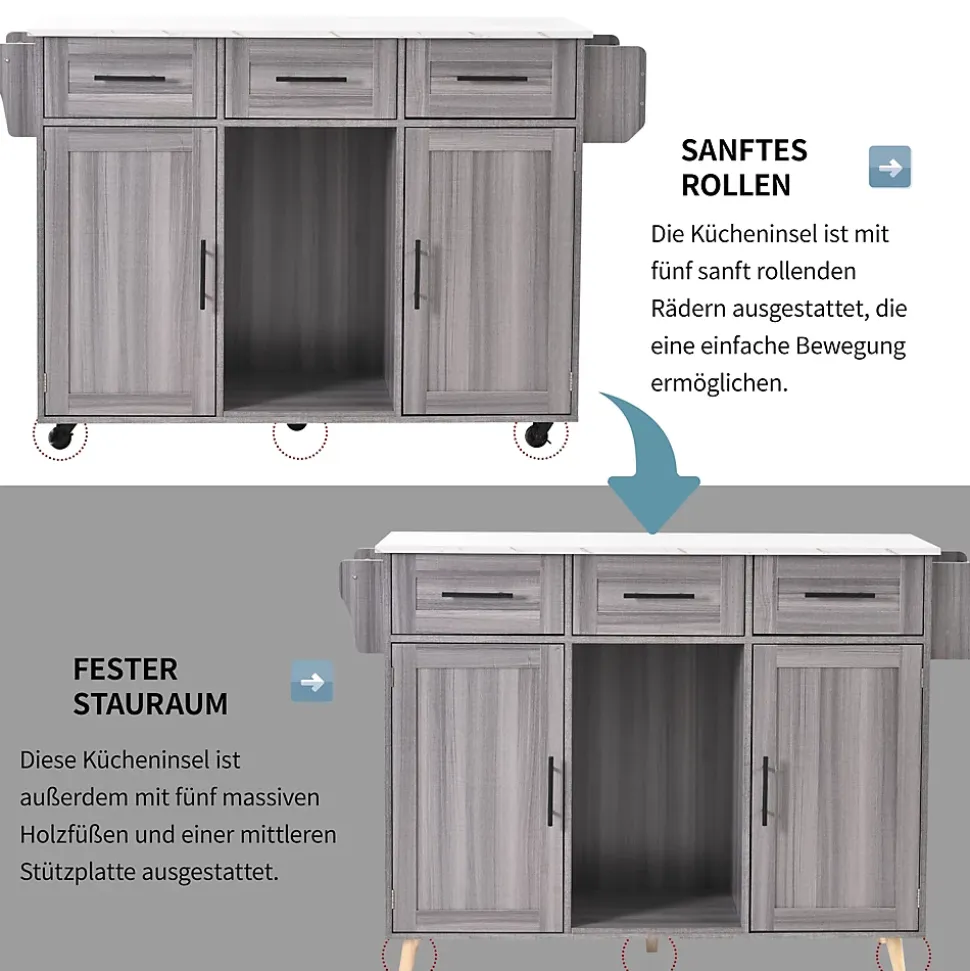 ▶ ▶ Détails ▶────────────────● Nom du produit : Îlot de Cuisine● Couleur : Gris● Dimensions : 120 × 71 × 91,5 cm● Matériau : Panneau de particules● Nombre de tiroirs : 3● Nombre de roulettes : 4● Nombre d’étagères ouvertes : 4● Poids net : 49,2 kg● Poids brut : 54,4 kg● Capacité de la table supérieure : 40 kg● Capacité de la table rabattable : 10 kg● Capacité de l’étagère : 20 kg● Capacité des tiroirs : 10 kg● Nombre recommandé de personnes : 2● Temps estimé de montage : 40-80 minutes● Nombre de colis : 2► Remarques ►※ Ce produit est expédié en 2 colis, qui peuvent arriver séparément. Merci de patienter.※ En raison des mesures manuelles, des écarts de taille de 2 à 3 cm peuvent se produire.※ La couleur réelle peut légèrement différer de l’image en raison de la lumière ou des réglages d’affichage. Veuillez vous référer au produit réel que vous recevez.※ Si vous avez des questions pendant l’installation, veuillez nous contacter dès que possible.