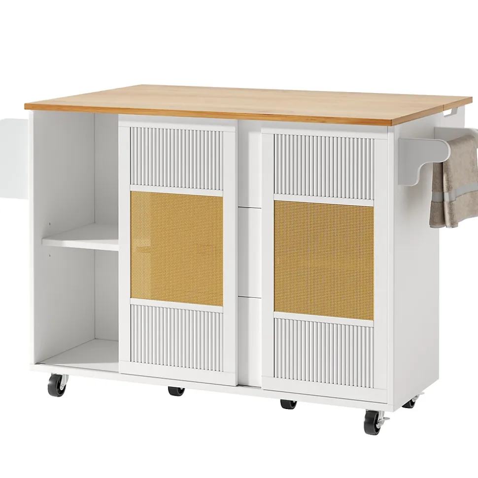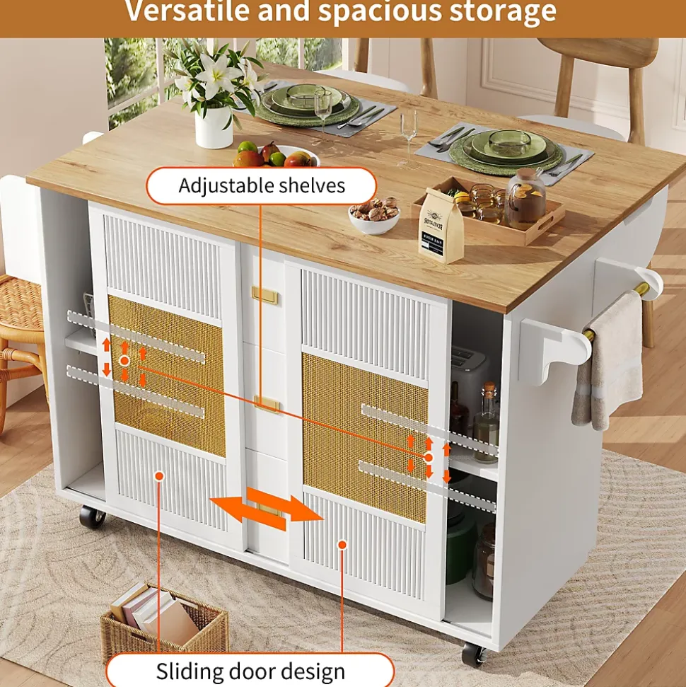 - 【Stockage Polyvalent】 Équipée de tiroirs, de compartiments ouverts, de portes coulissantes et d’étagères réglables, cette île permet une organisation flexible et personnalisable, idéale pour ranger vos ustensiles, épices ou autres objets essentiels.