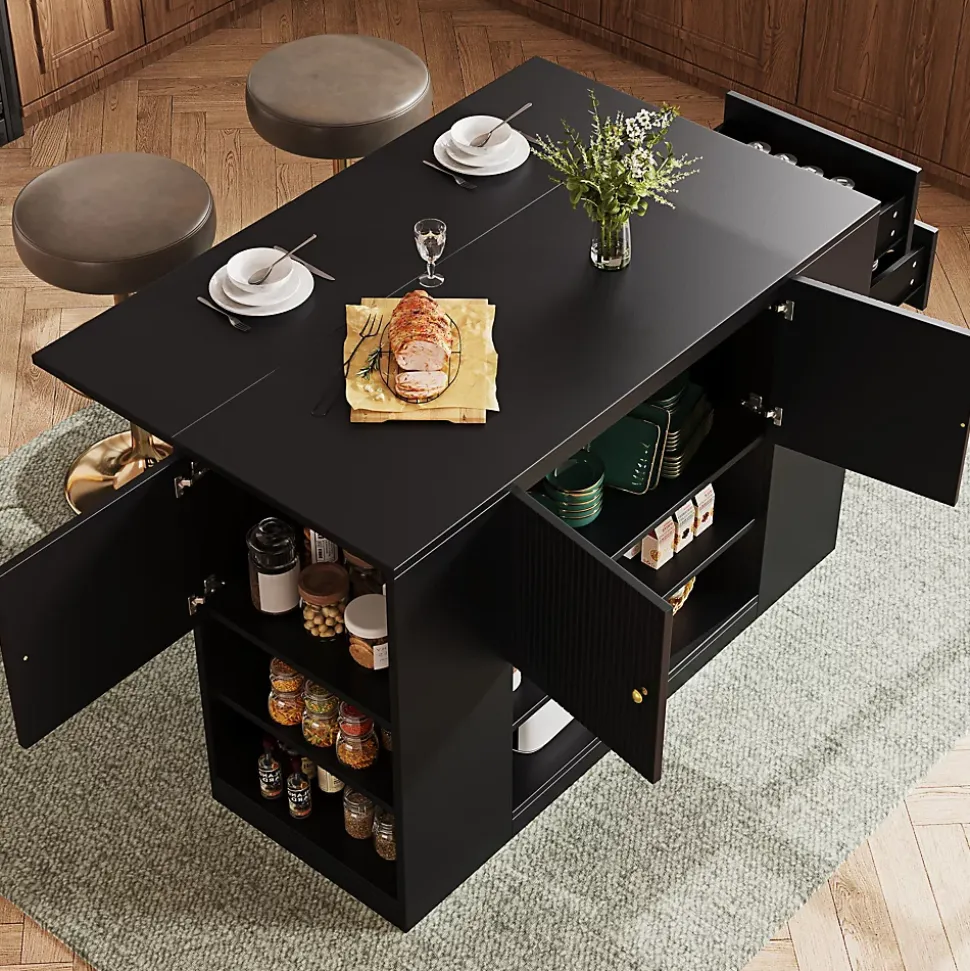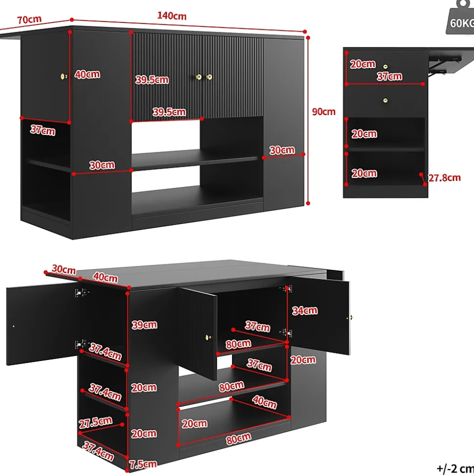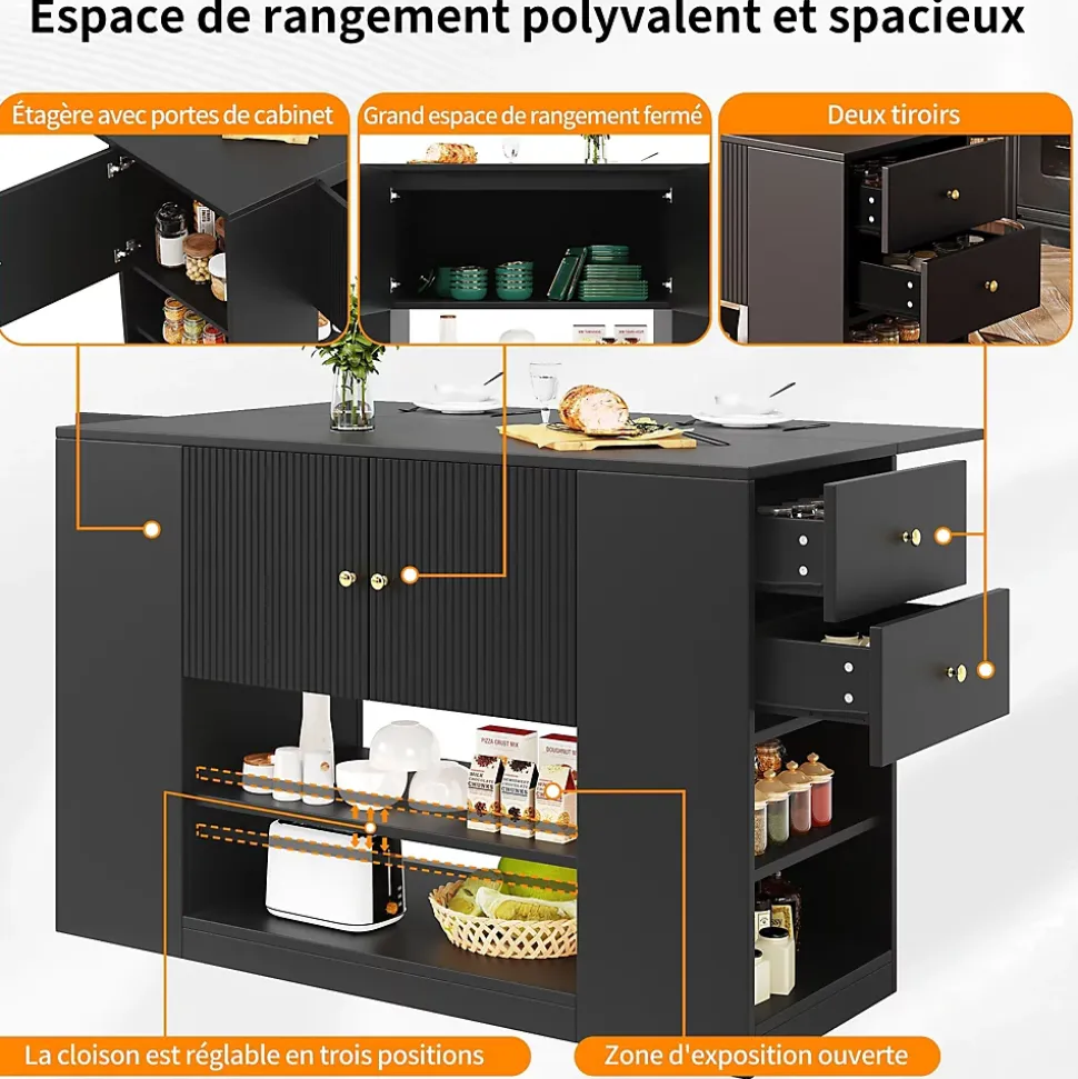 Caractéristiques du produit1. Cet îlot de cuisine est doté d’un plateau pliable qui se déplie pour former une table à manger de 70 cm de long.2. Design moderne et élégant : Il s’intègre harmonieusement à tous les styles d’intérieur, qu’ils soient modernes, champêtres ou classiques.3. Multifonctionnel : Ce meuble sert à la fois de table à manger et de meuble de rangement, optimisant ainsi la praticité et la flexibilité de votre cuisine.4. Grand espace de rangement : Les tiroirs et les étagères de chaque côté de l’îlot offrent un espace de rangement généreux pour répondre à tous vos besoins.5. Matériaux de qualité supérieure : Le plateau est fabriqué en MDF (panneau de fibres de moyenne densité) de haute qualité, alliant esthétique et durabilité, tout en étant facile à nettoyer et à entretenir. Les poignées en métal poli complètent l’élégance de l’îlot, pour un confort et une durabilité accrus.Spécifications du produit :1. Dimensions déplié : 140 x 70 x 90 cm (Longueur x Largeur x Hauteur)2. Dimensions plié : 110 x 40 x 90 cm (Longueur x Largeur x Hauteur)3. Poids du produit : 52,9 kg4. Matériaux : Panneaux de fibres de moyenne densité, métal5. Charge maximale : 60 kg6. Temps de montage : 1 à 2 heures7. Contenu de l’emballage : Un îlot de cuisine, accessoires de montage8. Quantité par colis : 29. Lieu d’origine : Chine10. Remarque : Les colis seront expédiés par lots et peuvent arriver en plusieurs fois. Veuillez prévoir quelques jours pour la livraison.