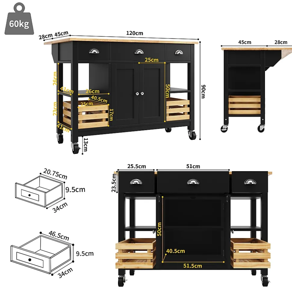 ▶ ▶ Détails ▶────────────────● Nom du produit : Îlot de cuisine● Couleur : Noir + Naturel● Dimensions du produit (déployé) : 120 × 73 × 90 cm● Dimensions du produit (replié) : 120 × 45 × 90 cm● Poids du produit : 40,7 kg● Matériau : Métal, MDF● Capacité de charge : 60 kg● Temps de montage : 30 minutes● Nombre de colis : 2● Contenu de la livraison : Une îlot de cuisine, pièces pour le montage► Remarques ►※ Ce produit est livré en 2 colis, qui peuvent arriver séparément. Merci de patienter.※ En raison de mesures manuelles, des écarts de 2 à 3 cm peuvent survenir.※ Toutes les images montrent le produit réel, mais des variations de couleur peuvent apparaître selon la lumière.※ Si vous avez des questions pendant l’installation, veuillez nous contacter dès que possible.