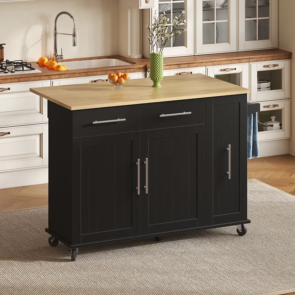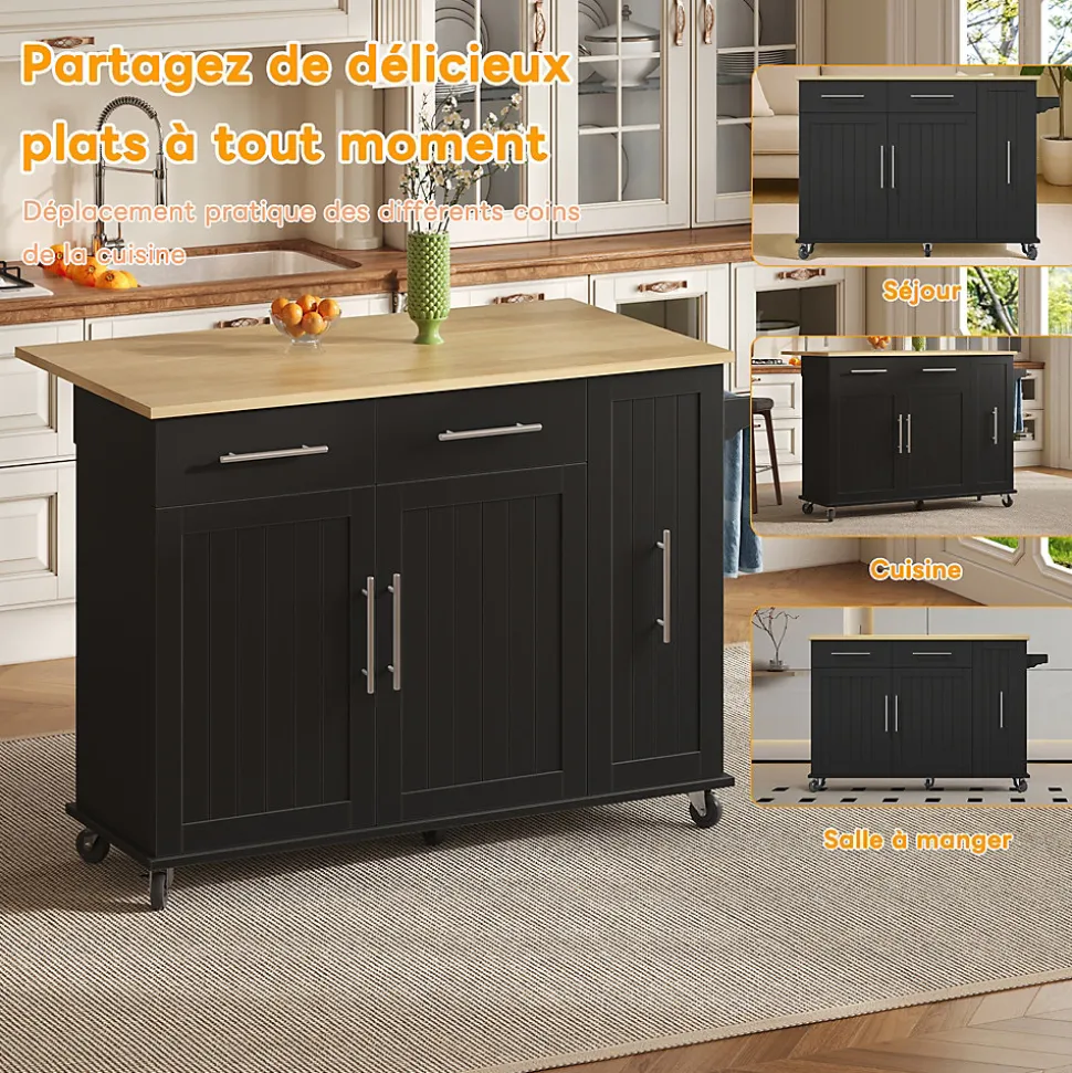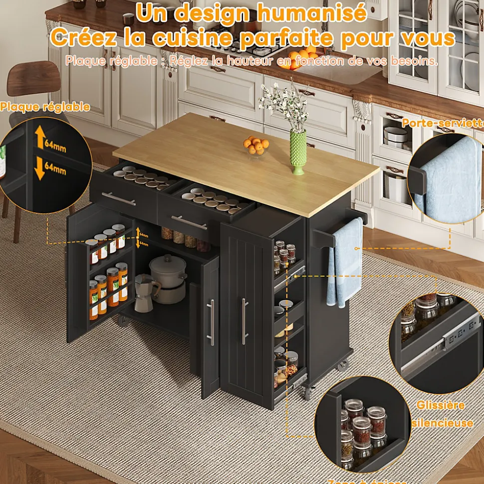 ▶ ▶ Détails ▶────────────────● Type de produit : Îlot de cuisine● Matériau : MDF● Couleur : Noir + Naturel● Pièces adaptées : Cuisine / Salle à manger / Salon● Forme de l’îlot de cuisine : Rectangulaire● Dimensions totales : 120 × 40 (extensible à 65) × 90 cm● Poids net : 51,5 kg● Plan de travail : Avec design Drop-Leaf rabattable● Tiroirs : 2● Étagère coulissante : 3 niveaux (niveau intermédiaire réglable en hauteur)● Étagères internes sur les portes : Oui● Mobilité : 5 roulettes universelles (2 avec frein)● Porte-serviettes : Oui● Montage requis : Oui● Nombre de colis : 2► Remarques ►※ La couleur réelle du produit peut légèrement différer de l’image en raison de l’éclairage ou de l’affichage.※ De légères variations peuvent survenir en raison de la mesure manuelle.※ Ce produit est livré en 2 colis.※ Si vous avez des questions lors de l’installation, veuillez contacter notre service client.