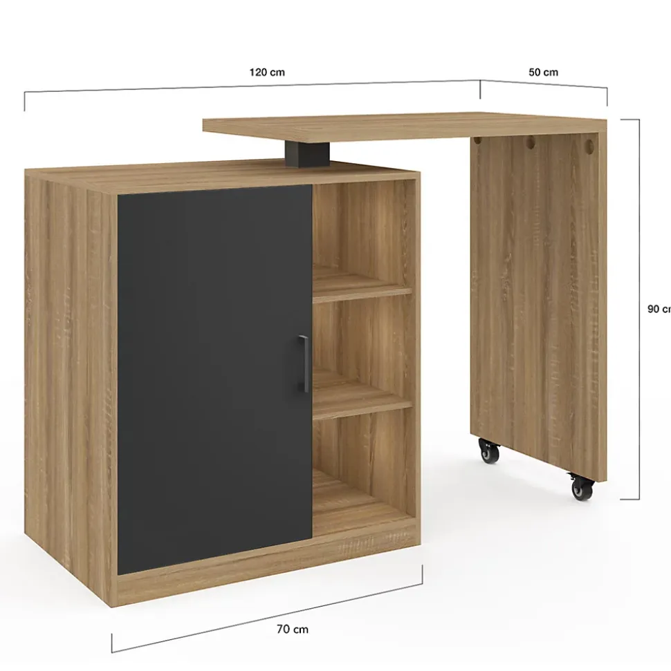 Optimisez l’espace de votre cuisine grâce à notre îlot central avec son plateau rotatif à roulettes avec freins et rangements intégrés !Le look tendance de cet îlot central, ses lignes droites et épurées et ses couleurs sobres tout en contraste lui permettent de s’adapter idéalement à tout type d’intérieur ! Il conférera un aspect net et rangé à votre cuisine !Son format compact, peu encombrant, facilite la circulation tout en évitant les pas inutiles au quotidien dans votre pièce de vie. Il structure l’espace de votre cuisine ! Parfait pour les espaces ouverts et aérés.D’une capacité d’accueil de 2 tabourets, grâce à son plateau pivotant à roulettes, vous pourrez augmenter la capacité d’accueil et votre plan de travail passant de 80 cm de long à 120 cm !Ultra fonctionnel, ce meuble de cuisine comporte de nombreux rangements. Le placard avec étagère centrale ajustable permettra d’entreposer vaisselle, couverts et ustensiles de cuisine. Quant aux trois étagères, elles seront parfaites pour garder à portée de main condiments, verres ou encore bouteilles. De quoi optimiser au maximum votre espace !Sa structure robuste en PB (panneaux de particules de bois, épaisseur 1,5 cm) et métal noir lui assure stabilité et robustesse pour un usage au quotidien !Tantôt coin repas, tantôt coin cuisine, avec sa triple fonction table haute de bar/plan de travail/meuble de rangement, il vous fera gagner du temps et de l’espace, et apportera un look factory à votre intérieur !Optez sans tarder pour cette installation tendance et conviviale à la fois fonctionnelle et décorative !Dimensions de l’îlot 80 à 120 cm bois imitation hêtre et noirDimensions globales : Longueur 80/120 x largeur 50 x Hauteur 90 cmDimensions du caisson fixe : L. 70 x l. 50 x H. 80 cmLargeur espace vide pour tabouret quand déployé : 46 cmDimensions intérieures placard : L. 40 x l. 47 x H. 72 cm avec étagère ajustable à l’intérieurDimensions niches latérales : L. 26 x l. 47 x H. 23 cmHauteur entre le caisson fixe et