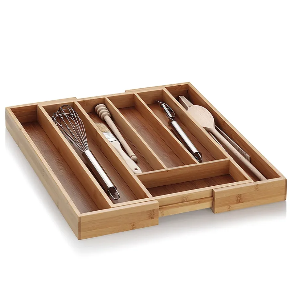 Retrouvez facilement vos couverts et ustensiles grâce à cet ingénieux range couverts en bambou. Extensible selon vos besoins, il peut s’adapter à la taille de votre tiroir. Pouvant mesurer de 28 à 39 cm de longueur il sera votre nouvel allié au quotidien. Il est pourvu de 5 compartiments et peut aller jusqu’à 7 compartiments.Collection : RANGEMENT Matière : Bois Couleur : Marron Longueur : 28.00 cm Largeur : 33.00 cm Hauteur : 5.00 cm
