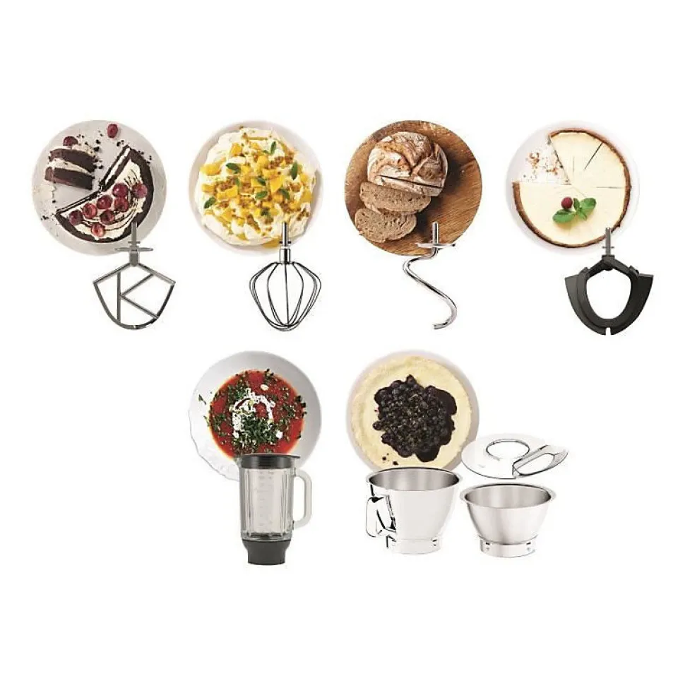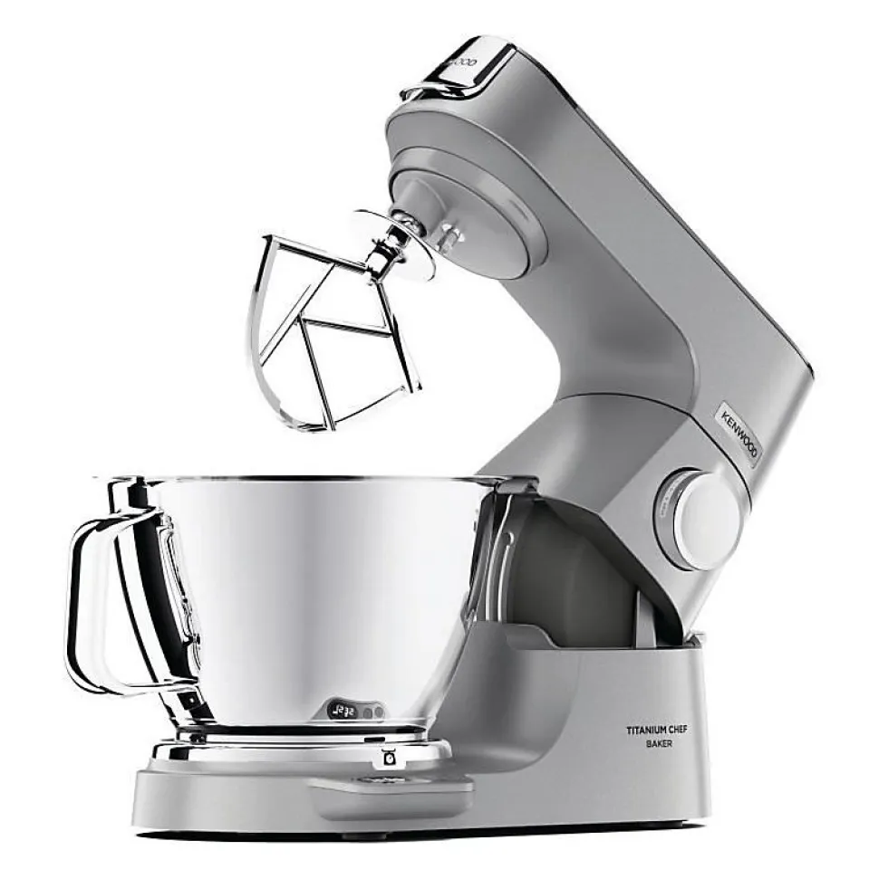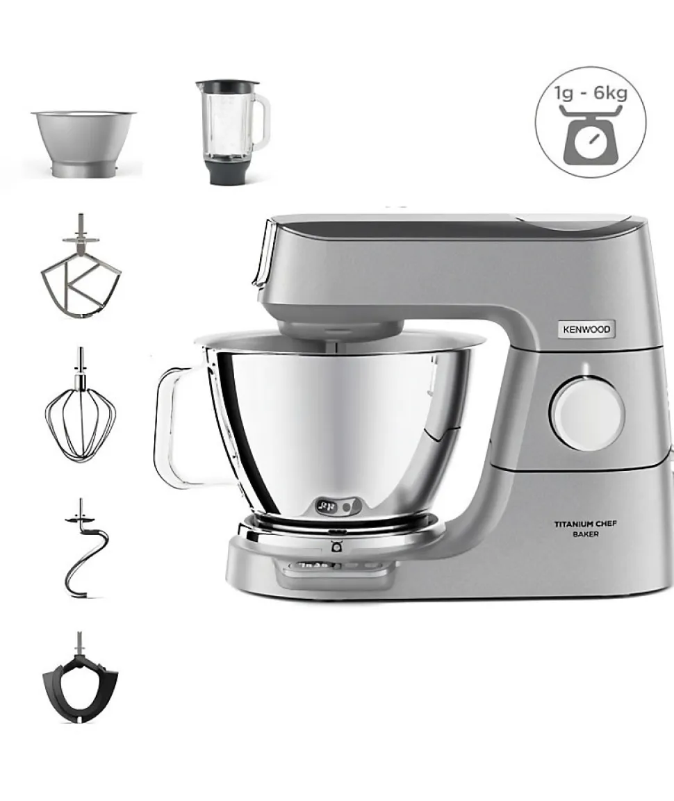 KENWOOD KVC85.124.SI – Robot pâtissier Titanium Chef Baker – 2 bols en inox 3,5L et 5L – Balance intégrée 6kg – Blender 1,8L – 1200W Le robot pâtissier multifonction, qui pese mais plus encore! Entierement réalisé en métal, il est doté de 2 bols d’une capacité de 5 L et 3,5 L. Doté du mouvement planétaire, d’un kit pâtisserie en acier inoxydable (pétrin, fouet, batteur K) et d’un batteur souple. Grâce a sa balance intégrée il est possible de peser au gramme