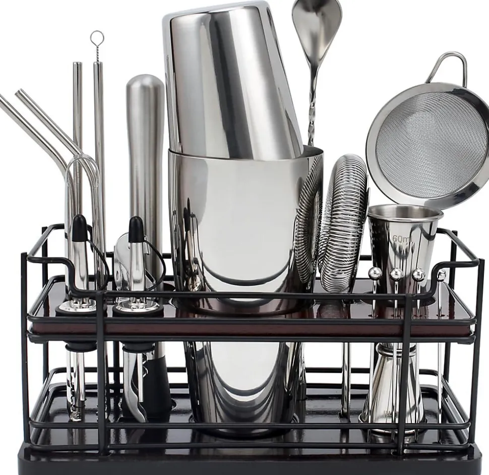 Préparez des cocktails parfaits chez vous ou en bar professionnel avec ce kit cocktail tout-en-un de 20 pièces. Il comprend un shaker Boston de 825 ml, des accessoires essentiels et un support en bambou élégant à double étage pour organiser vos outils avec style. Fabriqués en acier inoxydable de qualité, les accessoires résistent à la rouille et sont compatibles lave-vaisselle, garantissant durabilité et précision pour un usage quotidien ou festif. Le kit inclut également un livre de recettes pour créer margaritas, martinis et autres cocktails impressionnants. Idéal pour offrir en cadeau ou pour vos soirées, ce set polyvalent transforme chaque moment en expérience de bartending élégante et pratique.
