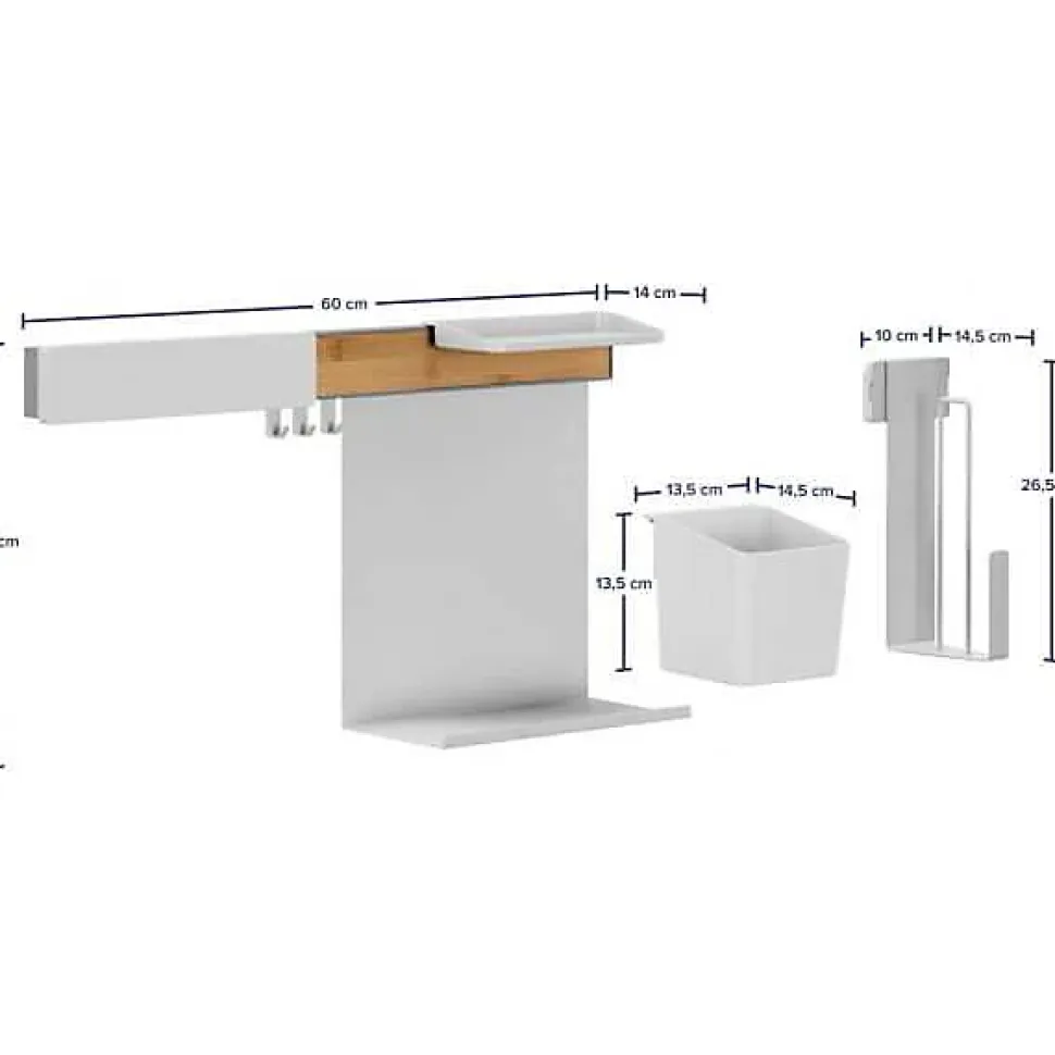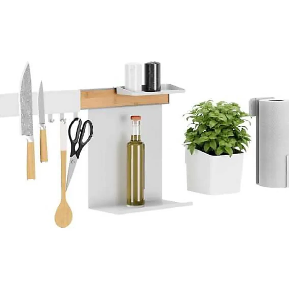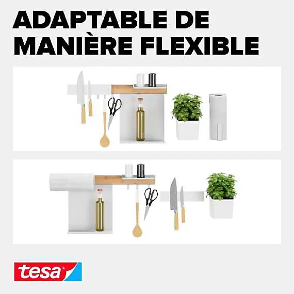 Kit Rangement Mural pour cuisine combi L de la gamme Kitchen. capacité de charge : 10 kg max. combinable de manière individualisée et flexible avec les autres produits KITCHEN grâce à la technique de fixation par colle, plus besoin de perçage ni d’outils s’enlève sans laisser de résidus Kit composé de :- 1 grande étagère suspendue- 1 petite étagère suspendue- 1 pot pour herbes aromatiques- 1 porte-couteaux- 1 porte-rouleau de cuisine- 3 crochets Pour optimiser votre rangement dans la cuisine et faciliter votre organisation.
