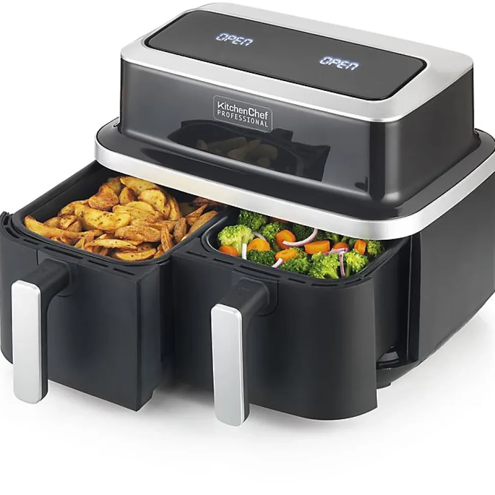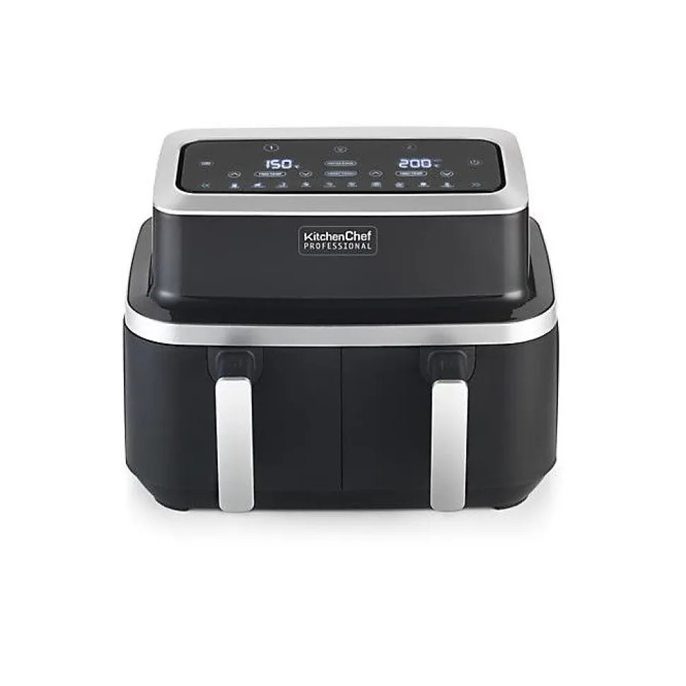 Friteuse sans huile double Kitchen Chef KCP.FR84AIRDUO offrant cuisson saine, grande capacité, double cuve indépendante, technologie Airfryer, commandes tactiles et sécurité renforcée.