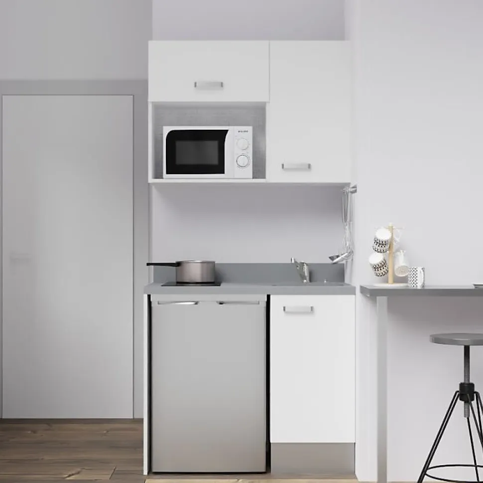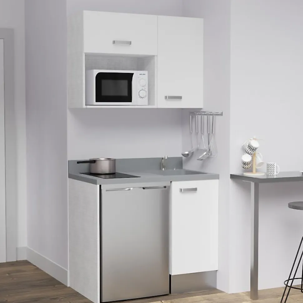 Découvrez nos kitchenettes contemporaines et durables. Le modèle K00L est le plus compact de la gamme de kitchenette. Sa largeur de 100 cm trouve sa place partout, même dans les plus petits studios. Le module est composé de meubles bas et hauts, d’un plan de travail monobloc avec évier évier intégré et d’emplacements pour un frigo et un micro-ondes. Composé de 80% de minéraux et 20 % de résine, le PlaniQuartz est à la fois élégant, durable et facile à installer. Personnalisez votre kitchenette avec ses : 4 coloris de façades au choix : blanc, gris, noir ou chêne 6 déclinaisons du Planiquartz. Coloris : blanc (Snova), gris (Cromo) ou noir (Néro) – Évier à gauche ou à droite Composition de la kitchenette K00L : 1 meuble bas sous évier 1 porte : L40 cm x H 70 cm x P 60 cm 1 jambage coloris Lino : L 60 cm x H 88 cm. 1 Planiquartz avec évier intégré (à droite ou à gauche), kit de vidage inclus (bonde et siphon) et découpe pour plaque de cuisson 2 feux : L100 cm x P63 cm (marge de tolérance 5mm), découpe pour l’encastrement : 49,7 cm x 28,1 cm (+/- 3mm) 1 socle PVC aspect alu (à recouper) : L 60 cm x H 17 cm (épaisseur 10 mm) 1 retour de socle PVC aspect alu : L 52.5 cm x H 17 cm (épaisseur 10 mm) 1 raccord de socle PVC aspect alu : H 17 cm 1 meuble de rangement haut 1 porte : L 40 cm x H 70 cm x P 35 cm 1 meuble haut avec emplacement pour micro-ondes et porte relevable : L 60 cm x H 70 cm x P 35 cm Poignées en inox brossé verni (possibilité de commander en option des poignées noires disponibles en accessoire). Tous les caissons et façades sont en panneau de particules mélaminé de 18 mm d’épaisseur. Caisson de meuble coloris gris clair aspect tissé. Garanties* : meubles 5 ans* planiquartz 3 ans* Emballage