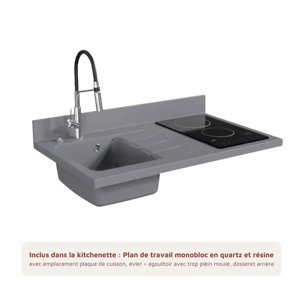 Kitchenette K00 – 100 cm – façades Blanc – Plan monobloc en quartz coloris Cromo évier à gauche – Electroménager Blanc