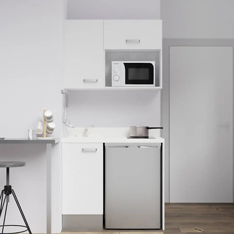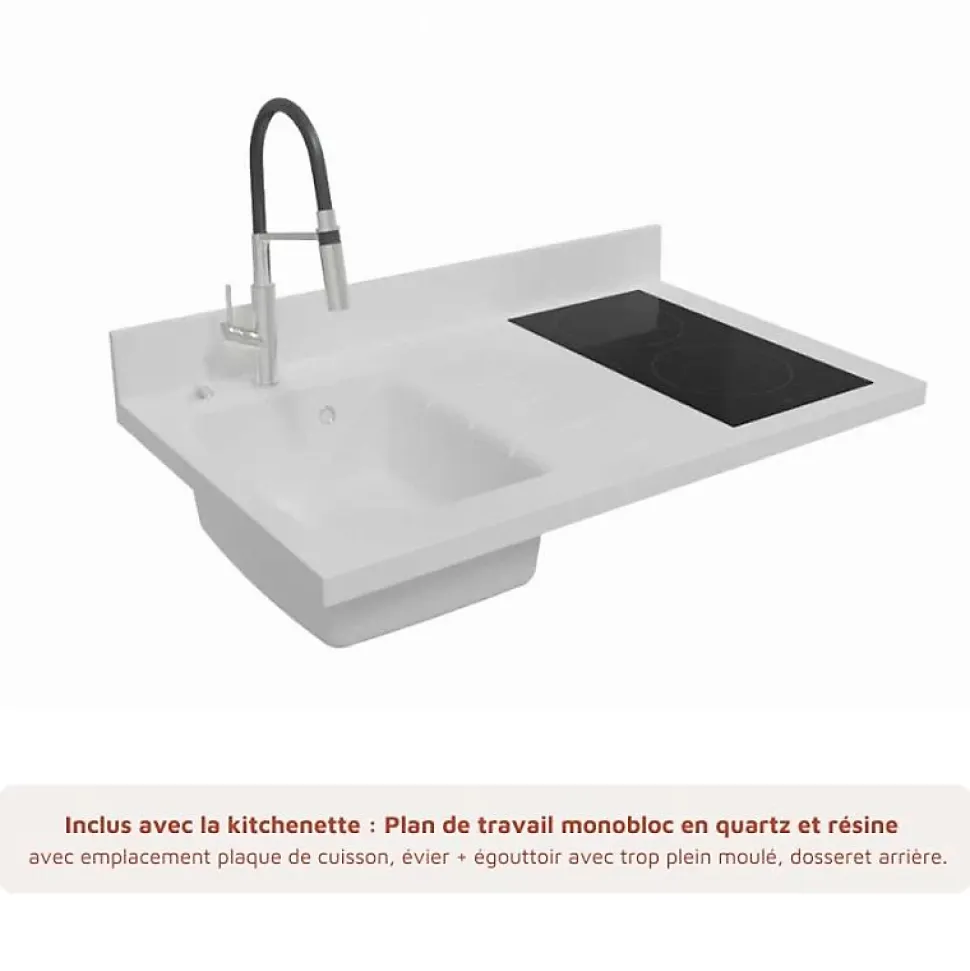 Découvrez nos kitchenettes contemporaines et durables. Le modèle K00L est le plus compact de la gamme de kitchenette. Sa largeur de 100 cm trouve sa place partout, même dans les plus petits studios. Le module est composé de meubles bas et hauts, d’un plan de travail monobloc avec évier évier intégré et d’emplacements pour un frigo et un micro-ondes. Composé de 80% de minéraux et 20 % de résine, le PlaniQuartz est à la fois élégant, durable et facile à installer. Personnalisez votre kitchenette avec ses : 4 coloris de façades au choix : blanc, gris, noir ou chêne 6 déclinaisons du Planiquartz. Coloris : blanc (Snova), gris (Cromo) ou noir (Néro) – Évier à gauche ou à droite Composition de la kitchenette K00L : 1 meuble bas sous évier 1 porte : L40 cm x H 70 cm x P 60 cm 1 jambage coloris Lino : L 60 cm x H 88 cm. 1 Planiquartz avec évier intégré (à droite ou à gauche), kit de vidage inclus (bonde et siphon) et découpe pour plaque de cuisson 2 feux : L100 cm x P63 cm (marge de tolérance 5mm), découpe pour l’encastrement : 49,7 cm x 28,1 cm (+/- 3mm) 1 socle PVC aspect alu (à recouper) : L 60 cm x H 17 cm (épaisseur 10 mm) 1 retour de socle PVC aspect alu : L 52.5 cm x H 17 cm (épaisseur 10 mm) 1 raccord de socle PVC aspect alu : H 17 cm 1 meuble de rangement haut 1 porte : L 40 cm x H 70 cm x P 35 cm 1 meuble haut avec emplacement pour micro-ondes et porte relevable : L 60 cm x H 70 cm x P 35 cm Poignées en inox brossé verni (possibilité de commander en option des poignées noires disponibles en accessoire). Tous les caissons et façades sont en panneau de particules mélaminé de 18 mm d’épaisseur. Caisson de meuble coloris gris clair aspect tissé. Garanties* : meubles 5 ans* planiquartz 3 ans* Emballage