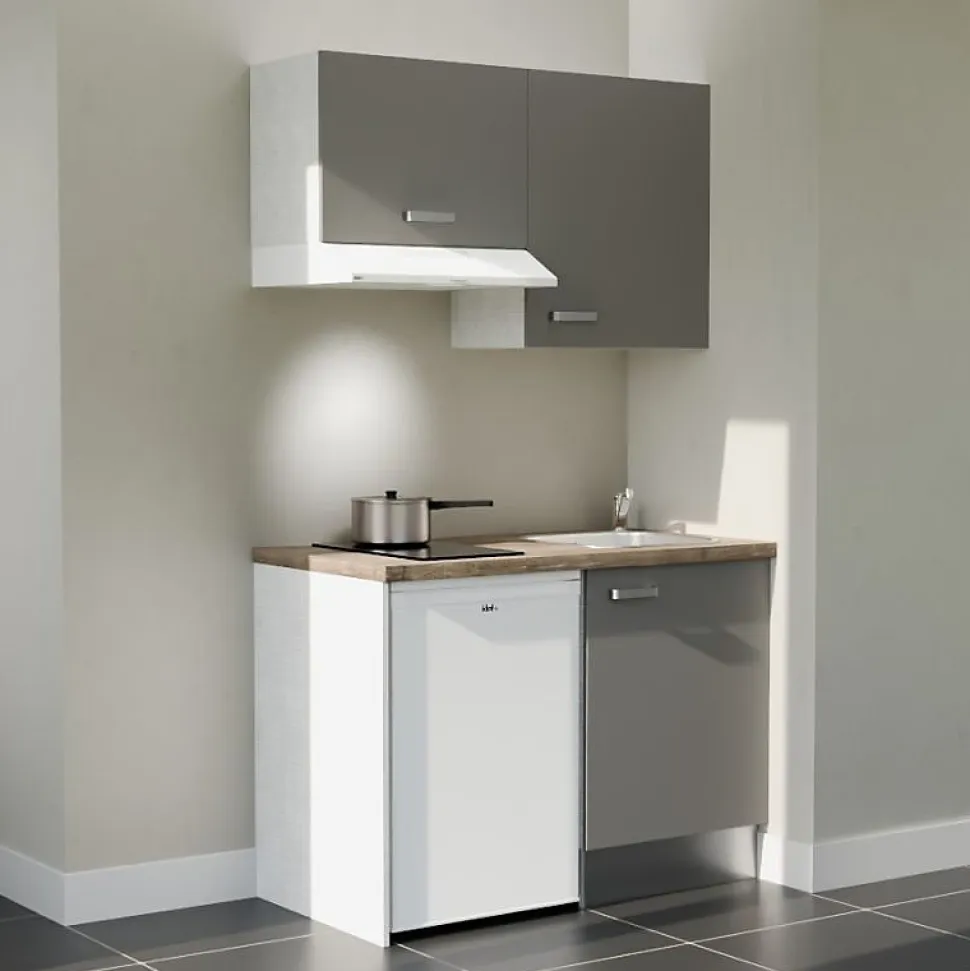 La kitchenette de 120 cm fonctionnelle et complète, proposée avec un plan de travail et un évier au choix. Elle vous permet d’intégrer l’essentiel dans un module compact de 120 cm avec un meuble bas sous évier, un meuble sur hotte, un meuble de rangement haut, ainsi qu’un emplacement pour intégrer un frigo top. Personnalisez votre kitchenette avec ses : 4 coloris de façades : blanc mat, gris mat, noir ou chêne Plan de travail et crédences au choix : blanc, chêne, gris effet béton, noir texturé effet pierre. 4 choix éviers à encastrer : Cuve Resiroc (blanc, gris, noir) ou Cuve Inox (Certaines combinaisons ne sont pas disponibles) Notre conseil déco : Les coloris bois (aspect chêne texturé) et gris des façades et du plan de travail sont différents. Nous vous conseillons plutôt choisir les associations suivantes : façades bois avec plan de travail blanc, gris ou noir ; façades blanches ou grises avec le plan de travail chêne ou noir. Reportez-vous aux images pour visualiser le rendu de chaque configuration sélectionnée ! Composition de la kitchenette K01L avec plan de travail et évier : 1 meuble bas sous évier une porte : L 60 x H 70 x P 60 cm Pieds réglables de 10 à 17 cm pour le caisson bas. 1 meuble de rangement haut une porte : L 60 x H 70 x P 35 cm 1 meuble haut sur hotte : L 60 x H 45 x P 35 cm 1 plan de travail stratifié : L 120 cm x P 63 cm Selon l’option choisie, crédences assorties au plan de travail : 1 crédence 120 cm de largeur x 35 cm de hauteur, un retour de crédence coté évier de 60 cm de largeur x 35 cm de hauteur. 1 évier encastrable au choix : Modèle RESIROC en résine, coloris blanc, gris ou noir 1 bac sans égouttoir L 54 cm x P 44 cm, équipé