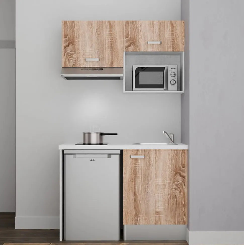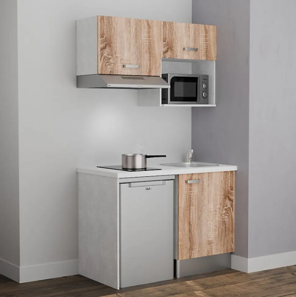 La kitchenette de 120 cm fonctionnelle et complète, proposée avec un plan de travail et un évier. Elle vous permet d’intégrer l’essentiel dans un module compact de 120 cm avec un meuble bas sous évier, un meuble haut sur hotte et un meuble pour micro-ondes, ainsi qu’un emplacement pour intégrer un frigo top. Personnalisez votre kitchenette avec ses : 4 coloris de façades : blanc, gris, noir ou chêne Plan de travail et crédences au choix : blanc, chêne, gris effet béton, noir texturé effet pierre 4 choix éviers à encastrer : Cuve Resiroc (blanc, gris, noir) ou Cuve Inox (Certaines combinaisons ne sont pas disponibles) Notre conseil déco : Les coloris bois (aspect chêne texturé) et gris des façades et du plan de travail sont différents. Reportez-vous aux images pour visualiser le rendu de chaque configuration sélectionnée ! Composition de la kitchenette K02 avec plan de travail et évier : 1 meuble bas sous évier une porte : L 60 x H 70 x P 60 cm Pieds réglables de 10 à 17 cm pour le caisson bas. 1 meuble haut sur hotte une porte : L 60 x H 45 x P 35 cm 1 meuble haut pour micro-ondes avec porte relevable : L 60 x H 70 x P 35 cm 1 plan de travail stratifié : L 120 cm x P 63 cm Selon l’option choisie, crédences assorties au plan de travail : 1 crédence 120 cm de largeur x 35 cm de hauteur, un retour de crédence coté évier de 60 cm de largeur x 35 cm de hauteur. 1 évier encastrable au choix : Modèle RESIROC en résine, coloris blanc, gris ou noir 1 bac sans égouttoir L 54 cm x P 44 cm, équipé d’un trop plein, vidage manuel de la bonde. L’évier Résiroc est conçu en matériaux composites (résine polyester, fibres de verre et charges minérales compressées) qui permettent une