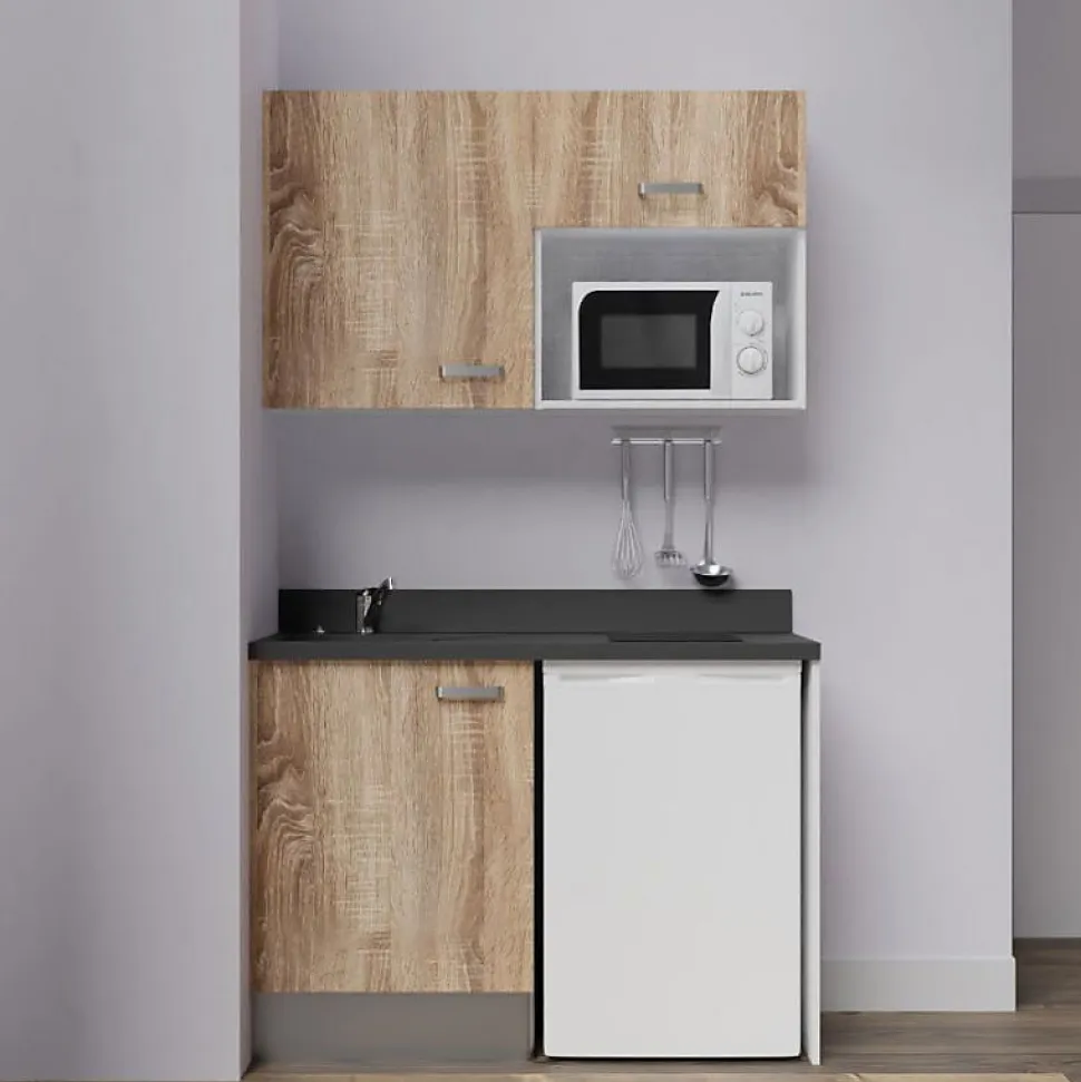 Découvrez nos kitchenettes contemporaines et durables. Le modèle K07 est un ensemble complet de kitchenette de 120 cm linéaire. Il comprend les meubles bas et hauts, avec emplacements pour intégrer un frigo top et un micro-ondes. Son plan de travail monobloc avec évier intégré et découpe pour table de cuisson est composé de 80% de minéraux et 20 % de résine. Ce PlaniQuartz est à la fois élégant, durable et facile à installer. Personnalisez votre kitchenette avec ses : 4 coloris de façades au choix : blanc, gris, noir ou chêne 6 déclinaisons du Planiquartz. Coloris : blanc (Snova), gris (Cromo) ou noir (Néro)- Évier à gauche ou à droite Composition de la kitchenette K07L : 1 meuble bas sous évier 1 porte : L 60 cm x H 70 cm x P 60 cm 1 jambage coloris Lino : L 60 cm x H 88 cm. Épaisseur 19 mm 1 plan monobloc planiquartz avec évier intégré (à droite ou à gauche), kit de vidage (bonde et siphon) et découpe pour plaque de cuisson 2 feux (découpe pour l’encastrement : 49,7 cm x 28,1 cm (+/- 3mm)) : L 120 x P 63 cm (marge de tolérance 5mm). 3 coloris au choix. 1 socle PVC aspect alu : L 60 cm x H 17 cm (épaisseur 10 mm) 1 retour de socle PVC aspect alu : L 52.5 cm x H 17 cm (épaisseur 10 mm) 1 raccord de socle PVC aspect alu : H 17 cm 1 meuble de rangement haut 1 porte : L 60 cm x H 70 cm x P 35 cm 1 meuble haut avec niche micro-ondes et porte relevable : L 60 cm x H 70 cm x P 35 cm Poignées en inox brossé verni Caissons et façades en panneau de particules mélaminé de 18 mm d’épaisseur. Caissons de meuble coloris gris clair aspect tissé. Garanties* : meubles 5 ans* planiquartz 3 ans* Emballage en carton 100% recyclable Conseils de pose de la kitchenette :
