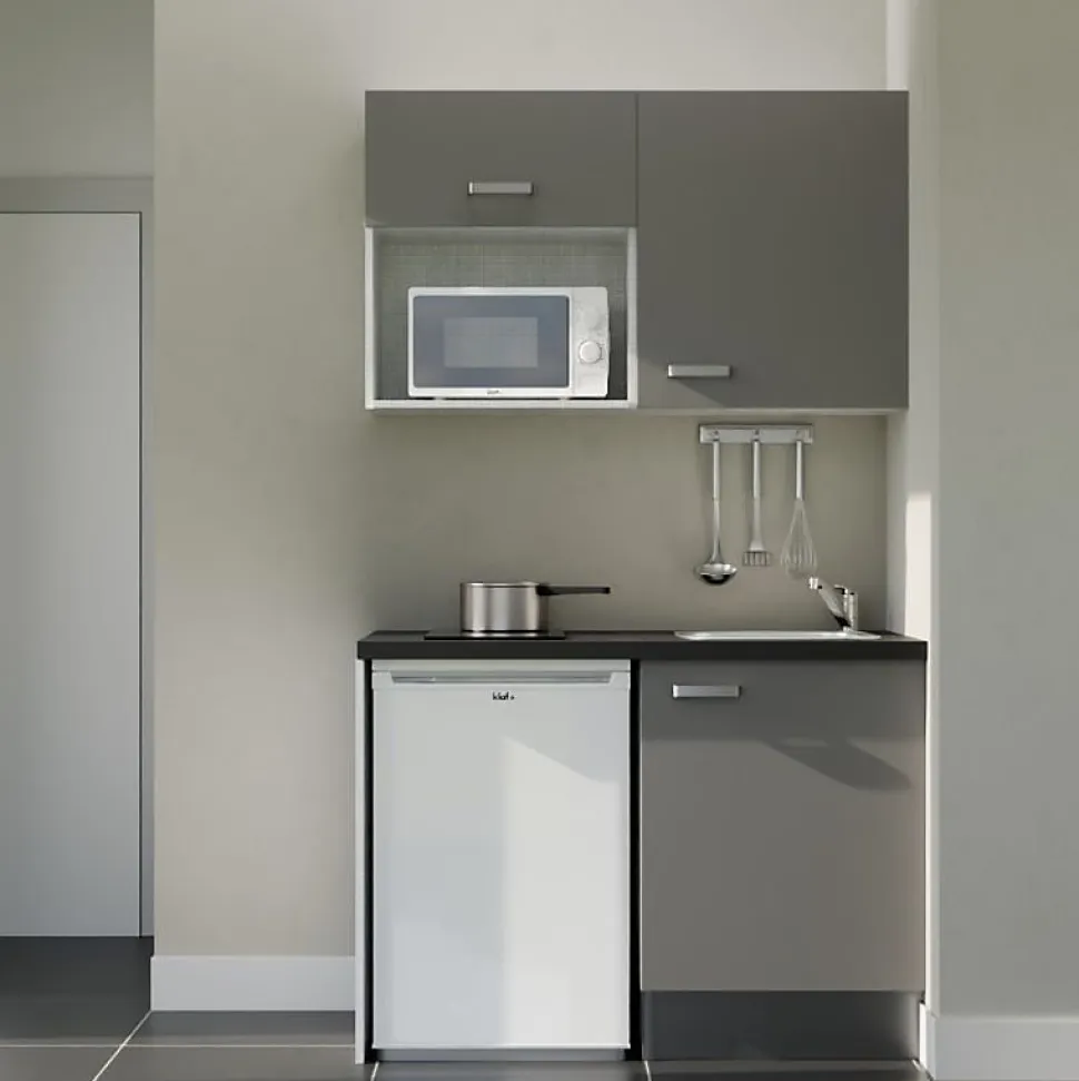 La kitchenette de 120 cm K07L, fonctionnelle et complète, proposée avec un plan de travail et un évier en inox inclut également l’électroménager. Elle vous permet d’intégrer l’essentiel dans un module compact de 120 cm avec un meuble bas sous évier, un meuble haut avec niche micro-ondes, un meuble de rangement haut, ainsi qu’un emplacement pour intégrer le frigo top. L’équipement électroménager comprend un micro-ondes, une plaque de cuisson vitrocéramique 2 feux et un frigo top. Personnalisez votre kitchenette en choisissant vos options et coloris disponibles : 4 coloris de façades au choix : blanc mat, gris mat, noir ou bois (chêne naturel) 4 coloris de plan de travail au choix : blanc mat, gris (aspect béton), noir (texturé effet pierre) ou bois (chêne Slavonie) Option avec ou sans crédences assorties 2 finitions pour l’électroménager (frigo et micro-ondes) : blanc ou inox Notre conseil déco : Les coloris bois (aspect chêne texturé) et gris des façades et du plan de travail sont différents. Nous vous conseillons plutôt choisir les associations suivantes : façades bois avec plan de travail blanc, gris ou noir ; façades blanches ou grises avec le plan de travail chêne ou noir. Reportez-vous aux images pour visualiser le rendu de chaque configuration sélectionnée ! Composition de la kitchenette modèle K07 avec plan de travail stratifié et évier inox : 1 meuble bas sous évier une porte : L 60 x H 70 x P 60 cm 1 meuble de rangement haut une porte : L 60 x H 70 x P 35 cm 1 meuble haut pour micro-ondes avec porte relevable : L 60 x H 70 x P 35 cm 1 plan de travail stratifié : L 120 cm x P 63 cm Selon