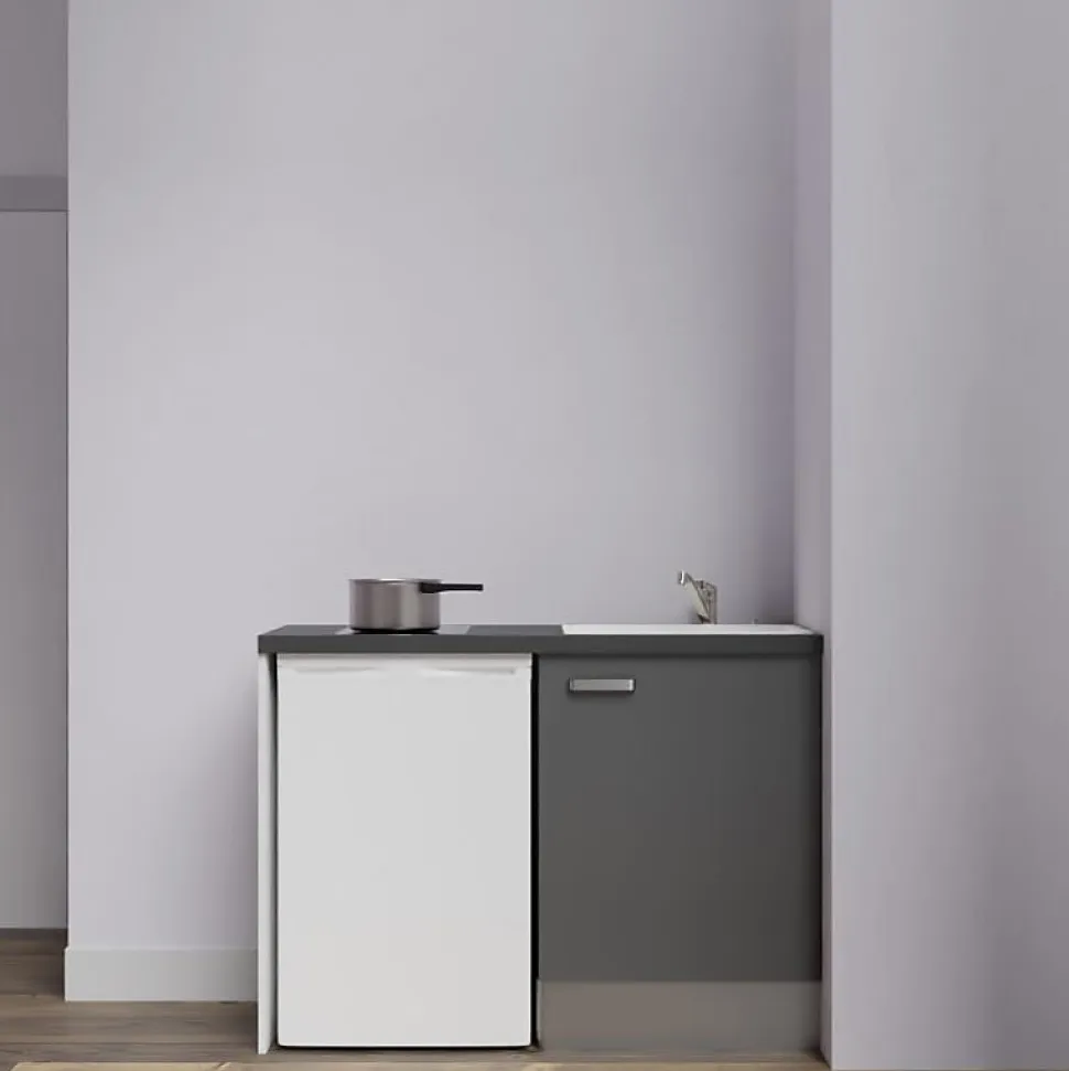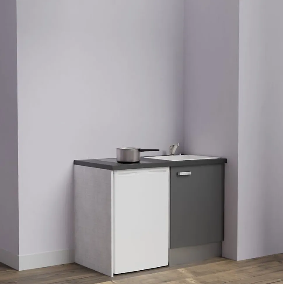La kitchenette basse de 120 cm, simple et fonctionnelle. Composée d’un meuble bas sous évier, d’un plan de travail et d’un évier, elle dispose d’un emplacement pour intégrer un frigo top. Personnalisez votre kitchenette avec ses : 4 coloris de façades : blanc mat, gris mat, noir ou chêne Plan de travail et crédences au choix : blanc, chêne, gris effet béton, noir texturé effet pierre. 4 choix éviers à encastrer : Cuve Resiroc (blanc, gris, noir) ou Cuve Inox (Certaines combinaisons ne sont pas disponibles) Notre conseil déco : Les coloris bois (aspect chêne texturé) et gris des façades et du plan de travail sont différents. Nous vous conseillons plutôt choisir les associations suivantes : façades bois avec plan de travail blanc, gris ou noir ; façades blanches ou grises avec le plan de travail chêne ou noir. Reportez-vous aux images pour visualiser le rendu de chaque configuration sélectionnée ! Composition de la kitchenette K08 avec plan de travail et évier : 1 meuble bas sous évier une porte : L 60 x H 70 x P 60 cm Pieds réglables de 10 à 17 cm pour le caisson bas. 1 plan de travail stratifié : L 120 cm x P 63 cm Selon l’option choisie, crédences assorties au plan de travail : 1 crédence 120 cm de largeur x 35 cm de hauteur, un retour de crédence coté évier de 60 cm de largeur x 35 cm de hauteur. 1 évier encastrable au choix : Modèle RESIROC en résine, coloris blanc, gris ou noir 1 bac sans égouttoir L 54 cm x P 44 cm, équipé d’un trop plein, vidage manuel de la bonde. L’évier Résiroc est conçu en matériaux composites (résine polyester, fibres de verre et charges minérales compressées) qui permettent une grande résistance aux rayures, chocs et températures
