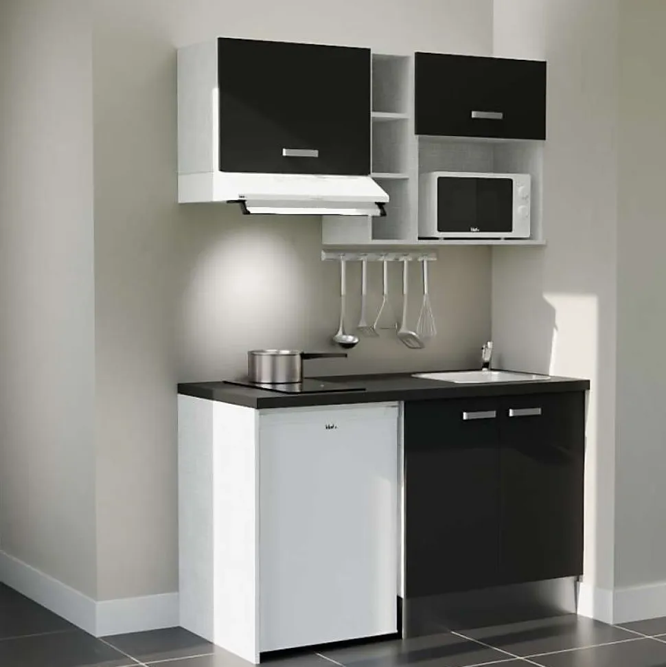 Ce module complet de kitchenette K13, fonctionnel et durable est proposé avec un plan de travail et un évier inox. Elle vous permet d’intégrer l’essentiel dans un linéaire de 140 cm comprenant : un meuble bas sous évier de 80 cm, un meuble haut avec emplacement micro-ondes, un meuble haut sur hotte, un casier de rangement ouvert, ainsi qu’un emplacement pour intégrer un frigo top. Personnalisez votre kitchenette en choisissant vos options et coloris disponibles : 4 coloris de façades au choix : blanc, gris, noir ou bois (chêne naturel) 4 coloris de plan de travail au choix : blanc mat, gris (aspect béton), noir (texturé effet pierre) ou bois (chêne Slavonie) Option avec ou sans crédences assorties Notre conseil déco : Les coloris bois (aspect chêne texturé) et gris des façades et du plan de travail sont différents. Nous vous conseillons plutôt choisir les associations suivantes : façades bois avec plan de travail blanc, gris ou noir ; façades blanches, noires ou grises avec le plan de travail chêne ou noir. Reportez-vous aux images pour visualiser le rendu de chaque configuration sélectionnée ! Composition de la kitchenette K13 avec plan de travail et évier : 1 meuble bas sous évier 2 portes : L 80 cm x H 70 cm x P 60 cm Pieds réglables de 10 à 17 cm pour le caisson bas. 1 jambage coloris Gris clair (coloris caisson) : L 60 cm x H 88 cm. Épaisseur 19 mm 1 plan de travail stratifié : L 140 cm x P 63 cm Selon l’option choisie, crédences assorties au plan de travail : 1 crédence 140 cm de largeur x 35 cm de hauteur, un retour de crédence coté
