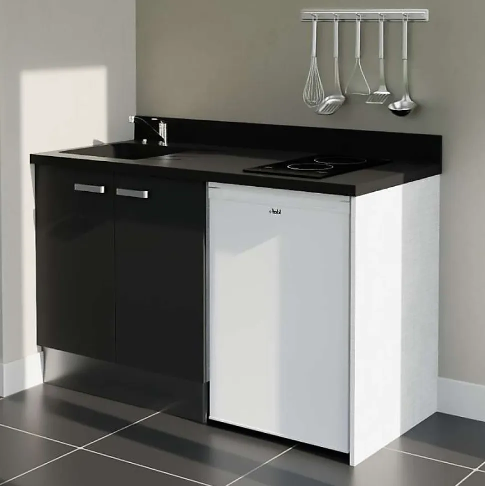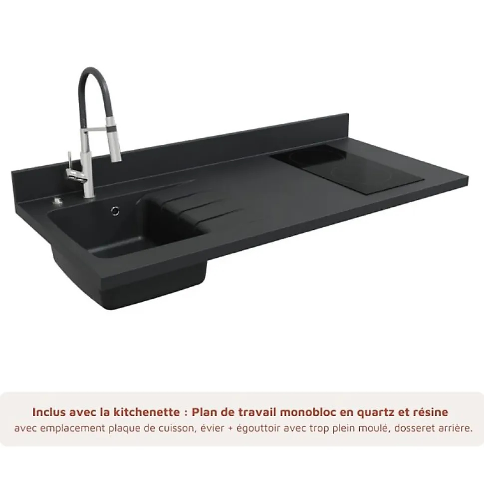 Découvrez nos kitchenettes contemporaines et durables. Le modèle K17L est une kitchenette basse de 140 cm linéaire avec un meuble bas sous évier de 80 cm, un emplacement frigo top, ainsi qu’un plan de travail monobloc avec évier intégré et découpe pour plaque de cuisson 2 feux. L’atout de cette kitchenette : Son plan monobloc composé de 80% de minéraux et 20 % de résine, très résistant dans le temps et facile à installer. Ce plan moulé évite les problèmes de piquage, de rouille, de cabossage de l’inox et de rayures du stratifié ou de l’inox. Personnalisez votre kitchenette avec ses : 4 coloris de façades au choix : blanc, gris, noir ou chêne 6 déclinaisons du Planiquartz : Coloris : blanc (Snova), gris (Cromo) ou noir (Néro)- Évier à gauche ou à droite Composition de la kitchenette K17L : 1 meuble bas sous évier 2 portes : L 80 cm x H 70 cm x P 60 cm 1 jambage coloris Gris clair (coloris caisson) : L 60 cm x H 88 cm. Épaisseur 19 mm 1 plan monobloc planiquartz avec évier intégré (à droite ou à gauche), kit de vidage (bonde et siphon) et découpe pour plaque de cuisson 2 feux (découpe pour l’encastrement : 49,7 cm x 28,1 cm (+/- 3mm) : L 140 x P 63 cm (marge de tolérance 5mm). 3 coloris au choix. 1 socle PVC aspect alu : L 80 cm x H 17 cm (épaisseur 10 mm) 1 retour de socle PVC aspect alu : L 52.5 cm x H 17 cm (épaisseur 10 mm) 1 raccord de socle PVC aspect alu : H 17 cm Poignées en inox brossé verni (poignées noires disponibles en accessoires). Caisson et façades en panneau de particules mélaminé de 18 mm d’épaisseur. Caisson de meuble coloris gris clair aspect tissé. Garanties* : meubles 5 ans* planiquartz 3 ans* Emballage en carton 100% recyclable