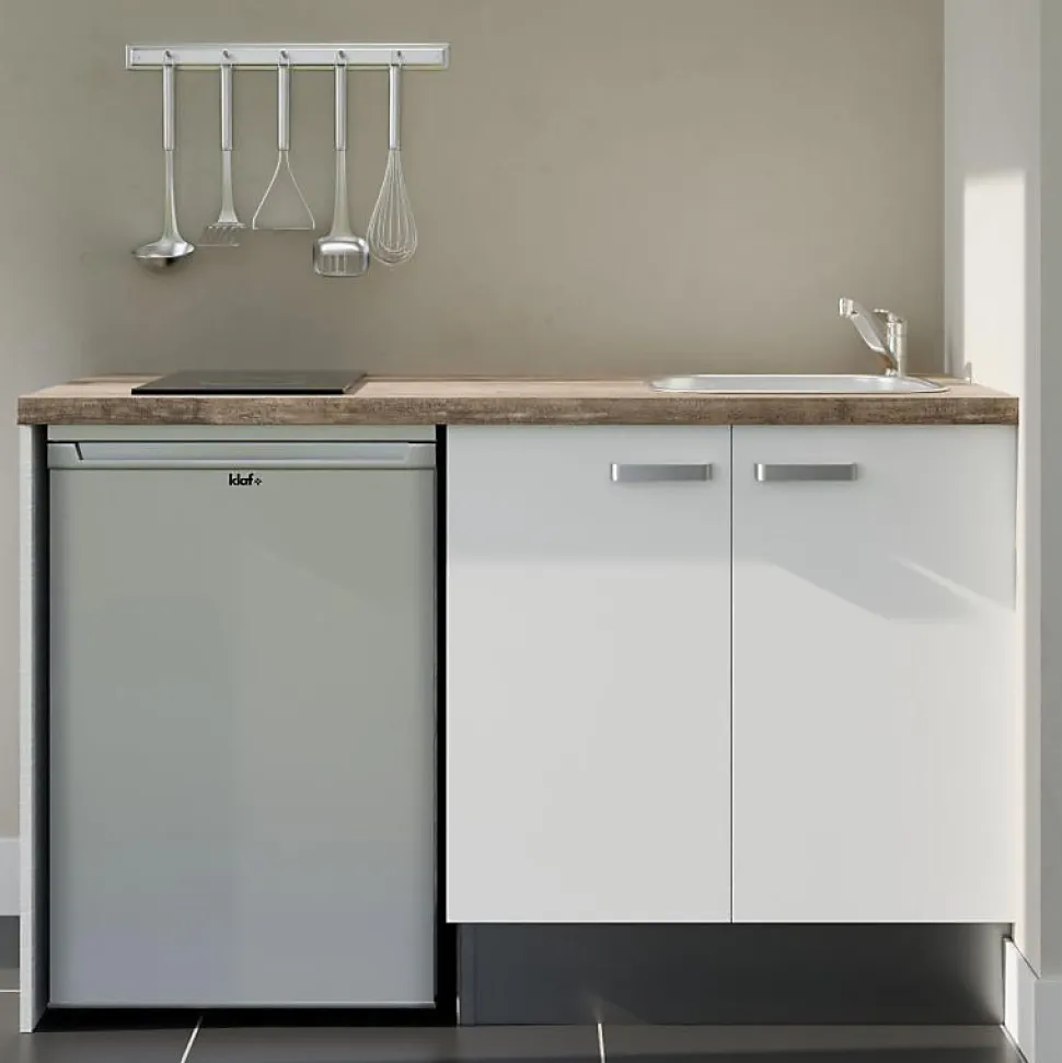 Kitchenette K17 façades Blanc - Plan de travail Bois - Crédences : Non - Evier inox - Electroménager Inox inclus