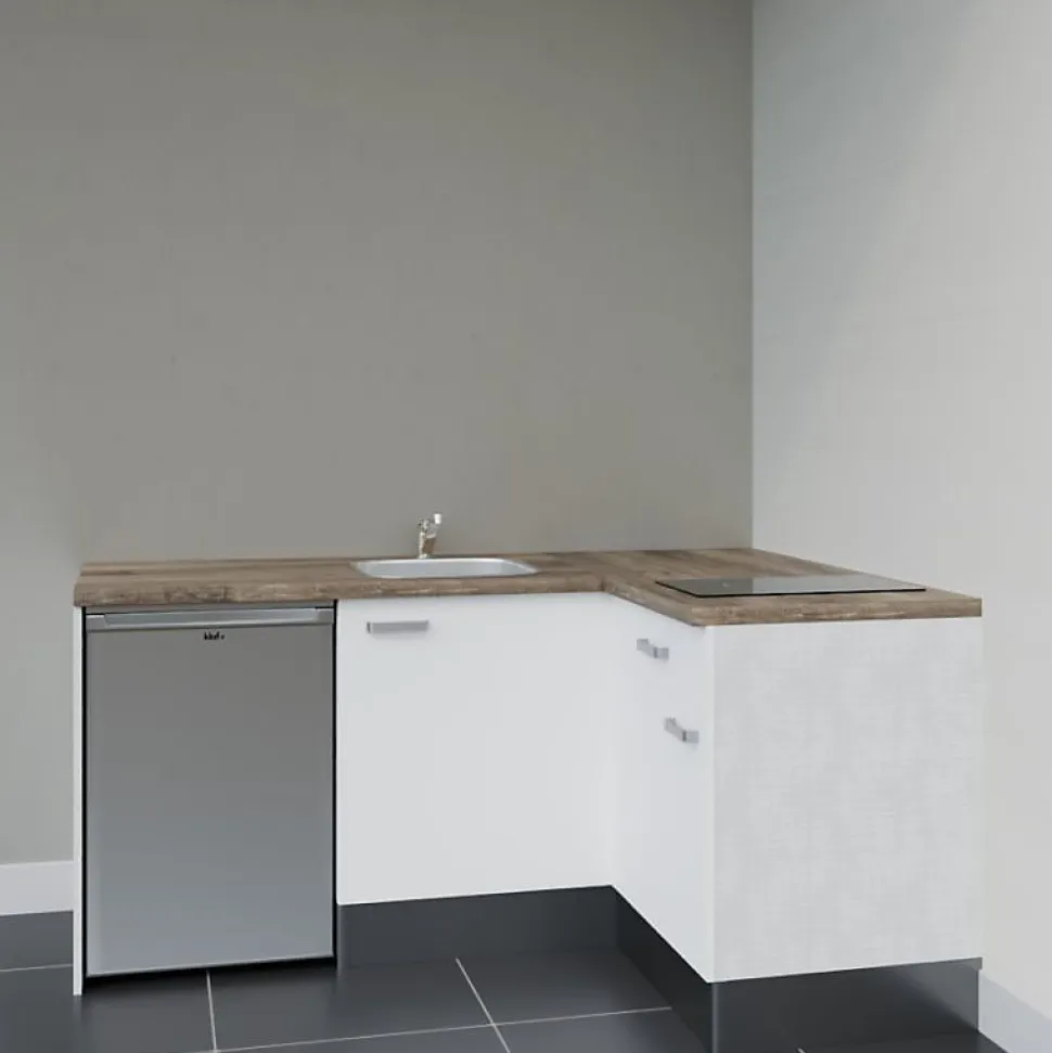Kitchenette KA01 façades Blanc - Plan de travail Bois - Crédences : Non - Evier inox - Electroménager Inox inclus
