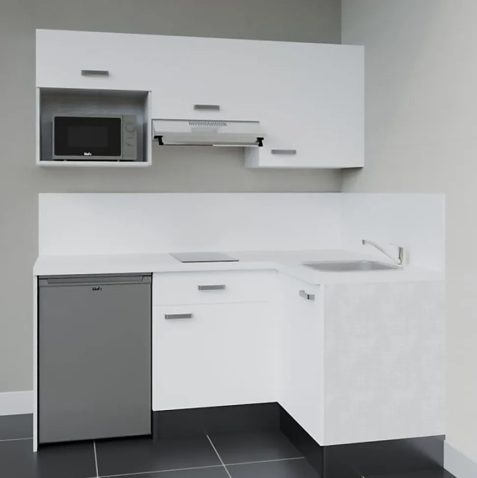 La kitchenette d’angle, simple et fonctionnelle. Composée de cinq meubles, d’un plan de travail et d’un évier en inox, elle dispose d’emplacements pour intégrer l’électroménager inclus : frigo top, plaque de cuisson vitrocéramique 2 feux, micro-ondes et hotte. Personnalisez votre kitchenette avec ses : 4 coloris de façades au choix : blanc, gris, noir ou bois (chêne naturel) 4 coloris de plan de travail au choix : blanc mat, gris (aspect béton), noir (texturé effet pierre) ou bois (chêne Slavonie) Option avec ou sans crédences assorties 2 coloris d’électroménager blanc ou gris inox Reportez-vous aux images pour visualiser le rendu de chaque configuration sélectionnée ! Composition de la kitchenette d’angle KA03 : 1 meuble bas sous évier une porte : L 60 x H 70 x P 60 cm 1 meuble bas une porte avec un tiroir : L 60 x H 70 x P 60 cm 1 meuble de rangement haut une porte : L 60 x H 70 x P 35 cm 1 meuble haut sur hotte : L 60 x H 45 x P 35 cm 1 meuble haut avec emplacement micro-ondes et porte relevable (vérin à gaz) : L 60 cm x H 70 cm x P 35 cm 2 plans de travail stratifié : L 140 cm x P 63 cm à recouper Selon l’option choisie, crédences assorties au plan de travail : 1 crédence 200 cm x 35 cm et 1 autre crédence de 140 cm x 35 cm à recouper. 1 évier sans égouttoir EVINOX. Dimension 44×44 cm. Ce modèle est composé d’inox SS304 pour une grande durabilité et d’une finition brossée très élégante. 1 jambage bas : L 60 x H 88 cm