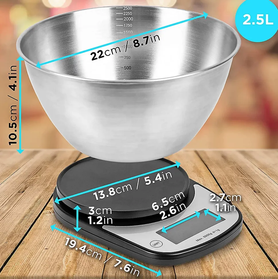La balance de cuisine KS5000 BKSS de Duronic vous accompagnera dans toutes vos préparations. Facile à utiliser grâce à ses deux touches, toute la famille pourra participer. La KS5000 BKSS a une capacité de 5 kg et dispose d’un large bol en inox de 2.5 litres afin de réaliser vos préparations directement dans le contenant. La précision de cette balance vous permet de l’utiliser également comme balance postale.Ce modèle bénéficie d’une fonction TARE permettant d’ajouter du poids au fur et à mesure. Il suffit par exemple de placer votre contenant sur la plateforme de pesée et d’appuyer sur la touche TARE pour remettre la balance à zéro. Vous pouvez alors peser votre premier ingrédient, remettre la balance à zéro et en ajouter un second, etc. Cette fonction présente un gain de temps en vous permettant de mesurer tous vos ingrédients dans un seul contenant.La KS5000 BKSS affiche les résultats dans différentes unités de mesure : vous pouvez passer des grammes aux livres et onces et des millilitres aux onces liquides en n’appuyant que sur une seule touche. Vous pouvez réaliser des recettes internationales en étant sûr d’avoir les bonnes qualités ! Il n’est plus nécessaire de faire travailler vos méninges ou de passer par un convertisseur en ligne.Les résultats sont calculés par 4 capteurs très précis, cette balance peut donc être utilisée pour peser différents objets ; par exemple, des lettres pour calculer les frais de port. De plus, les résultats sont précis à 1 g près. Les mesures sont affichées sur un large écran rétroéclairé afin d’assurer une lecture claire et lisible des résultats. Cette balance bénéficie également d’un indicateur de batterie faible et d’un indicateur de surcharge.Caractéristiques. Taille de la surface: 19.4 x 13.8 x 3 cm. Couleur: noir. Taille du bol: 22 x 10.5 cm. Capacité du bol: 2.5 litres. Bol amovible. Capacité de pesée maximale: 5 kg. Poids: 440 g. Unités: grammes (g), millilitres (ml), livres et onces (lb.o