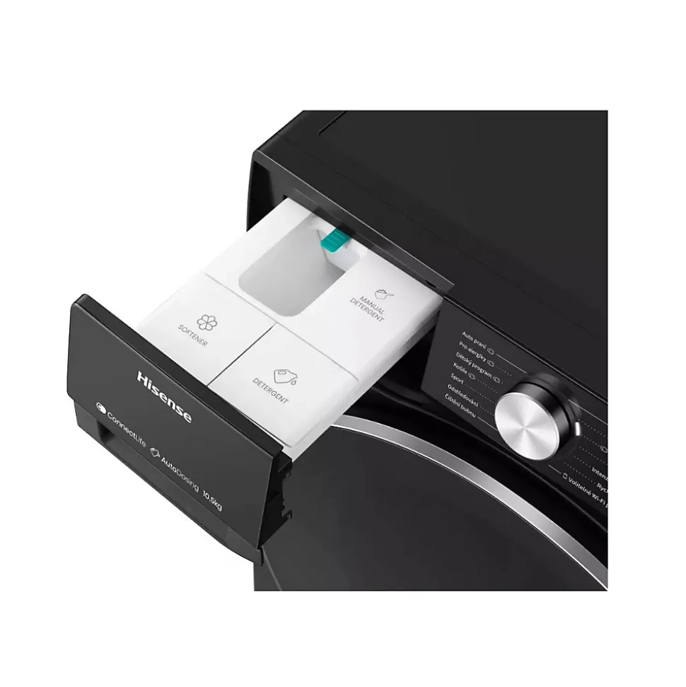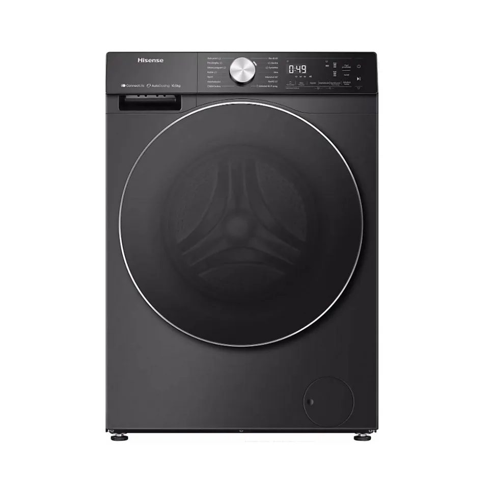 Lave-linge frontal 10.5 kg 1400 tours/min noir Hisense – Lave-linge hublot WF5S1045BB de Hisense.Un réservoir stock la lessive et l’adoucissant et diffuse la quantité optimale à chaque cycle.Gardez un œil sur vos consommations d’eau et d’électricité.Un débit d’eau puissant et rapide pour un nettoyage efficace.Un traitement additionnel à la vapeur est disponible sur certains programmes en fin de cycle afin d’éliminer allergènes et bactéries. – Type de produit : Lave-linge frontal.Capacité de lavage (kg) : 10.5.Classe d’efficacité énergétique : A.Vitesse d’essorage (trs/min) : 1400.Classe d’efficacité d’essorage : B.Niveau sonore max.(dB) : 72.Classe d’émission de bruit (en essorage) : A.Conso. énergie /100 cycles (kWh) : 52.Conso. eau cycle Eco 40-60 (L/cycle) : 41.Durée cycle Eco 40-60 (h:min) : 3:59.Volume tambour (L) : 66.Lave-linge connecté : Oui.Technologie vapeur : Oui.Nbre de programmes : 15.Coton : Oui.Eco 40-60° : Oui.Délicat : Oui.Laine : Oui.Rapide : Oui.Couette / Duvet : Oui.Sport : Oui.Programmes spéciaux : Coton couleur, Mélange / Mix, Vapeur anti-allergies, Vapeur spécial bébé, Couleurs foncées , Rinçage + Essorage, Nettoyage du tambour.Touches sensitives : Oui.Départ différé : Non.Fin différée : Oui.Rinçage plus : Oui.Variation d’essorage : Oui.Touches spéciales : Dosage automatique, Prélavage, Favoris.Ecran : Oui.Type d’affichage : LED digital.Type de moteur : Inverter.Sécurité enfant : Oui.Autre(s) : Contrôle de l’équilibre du tambour.Couleur : Noir.Hauteur (cm) : 84.5.Largeur (cm) : 59.5.Profondeur (cm) : 61.Poids (kg) : 69.
