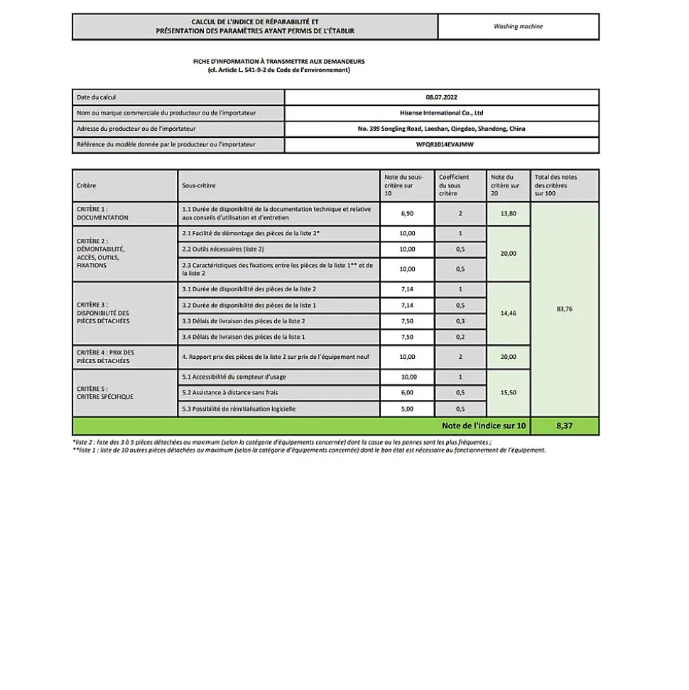 Lave-linge frontal 10kg 1400tours/min Hisense – Lave-linge hublot Hisense WFQR1014EVAJMW. Un réservoir stock la lessive et l’adoucissant et diffuse la quantité optimale à chaque cycle. Contrôlez votre lave-linge à distance grâce à la fonction WIFI. Un débit d’eau puissant et rapide pour un nettoyage efficace. Un traitement additionnel à la vapeur est disponible sur certains programmes en fin de cycle afin d’éliminer allergènes et bactéries. – Type : Lave-linge.Type de construction : Pose libre.Fonction séchage : Non.Type de chargement : Frontal.Capacité nominale programme Eco 40-60 (kg) : 10.Classe d’efficacité énergétique : A.Indice d’efficacité de lavage : 1.031.Efficacité de rinçage (g/kg) : 4.Conso. d’énergie pondérée pour 100 cycles (kWh) : 51.Conso. d’énergie cycle lavage »Eco 40-60 » (kWh) : 0.512.Conso. d’eau pondérée par cycle (litres) : 46.Temp. max. (°C) à l’intérieur du textile traité (capacité nominale) : 42.Temp. max. (°C) à l’intérieur du textile traité (moitié) : 28.Temp. max. (°C) à l’intérieur du textile traité (quart) : 25.Taux d’humidité résiduelle pondéré (%) : 52.Vitesse d’essorage (t/min) : 1400.Classe d’efficacité d’essorage : B.Durée du programme »Eco 40-60 » capacité nominale (h:min) : 3:59.Durée du programme »Eco 40-60 » moitié (h:min) : 2:58.Durée du programme »Eco 40-60 » quart (h:min) : 2:38.Emissions de bruit acoustique dans l’air (dB(A)) : 72.Classe d’émission de bruit acoustique dans l’air : A.Niveau sonore lavage (dB) : 56.Niveau sonore max.(dB) : 72.Classe d’émission de bruit (en essorage) : A.Volume tambour (L) : 66.Lave-linge connecté : Oui.Type de connectivité : WiFi.Technologie vapeur : Oui.Le(s) plus-produit(s) : Autodosage.Finition / Nuance : Argent.Nbre de programmes : 14.Coton : Oui.Eco 40-60° : Oui.Délicat : Oui.Laine : Oui.Rapide :
