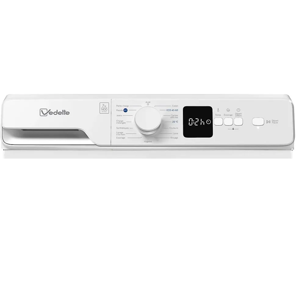 Lave-linge frontal 7kg 1400 tours/min Vedette – Le lave-linge frontal LFV274W de Vedette est doté d’un programme Hygiène qui élimine de vos vêtements et masques les principaux virus et jusqu’à 99,9% des bactéries grâce à une phase de lavage de 30 minutes à une température légèrement supérieure à 60° C. Le programme Rapide 60′ permet de laver en seulement une heure une charge quotidienne de linge normalement sale, tout en garantissant un résultat de lavage parfait. Le programme Jean est spécialement conçu pour laver les jeans(et vêtements de couleur sombre). Il permet de réduire le délavage et son rinçage renforcé évite toute trace résiduelle de lessive. – Type de produit : Lave-linge frontal.Fonction séchage : Non.Type de chargement : Frontal.Capacité nominale programme Eco 40-60 (kg) : 7.IEE : 79.8.Classe d’efficacité énergétique : D.Indice d’efficacité de lavage : 1.031.Efficacité de rinçage (g/kg) : 5.Conso. d’énergie pondérée pour 100 cycles (kWh) : 69.Conso. d’énergie cycle lavage »Eco 40-60 » (kWh) : 0.688.Conso. d’eau pondérée par cycle (litres) : 45.Temp. max. (°C) à l’intérieur du textile traité (capacité nominale) : 50.Temp. max. (°C) à l’intérieur du textile traité (moitié) : 27.Temp. max. (°C) à l’intérieur du textile traité (quart) : 23.Taux d’humidité résiduelle pondéré (%) : 51.6.Vitesse d’essorage (t/min) : 1400.Classe d’efficacité d’essorage : B.Durée du programme »Eco 40-60 » capacité nominale (h:min) : 3:28.Durée du programme »Eco 40-60 » moitié (h:min) : 2:40.Durée du programme »Eco 40-60 » quart (h:min) : 2:40.Emissions de bruit acoustique dans l’air (dB(A)) : 79.Classe d’émission de bruit acoustique dans l’air : C.Mode arrêt (W) : 0.5.Mode veille (W) : 1.Démarrage différé (W) : 4.Type de construction : Pose libre.Volume tambour (L) : 45.Lave-linge connecté : Non.Capacité variable automatique :