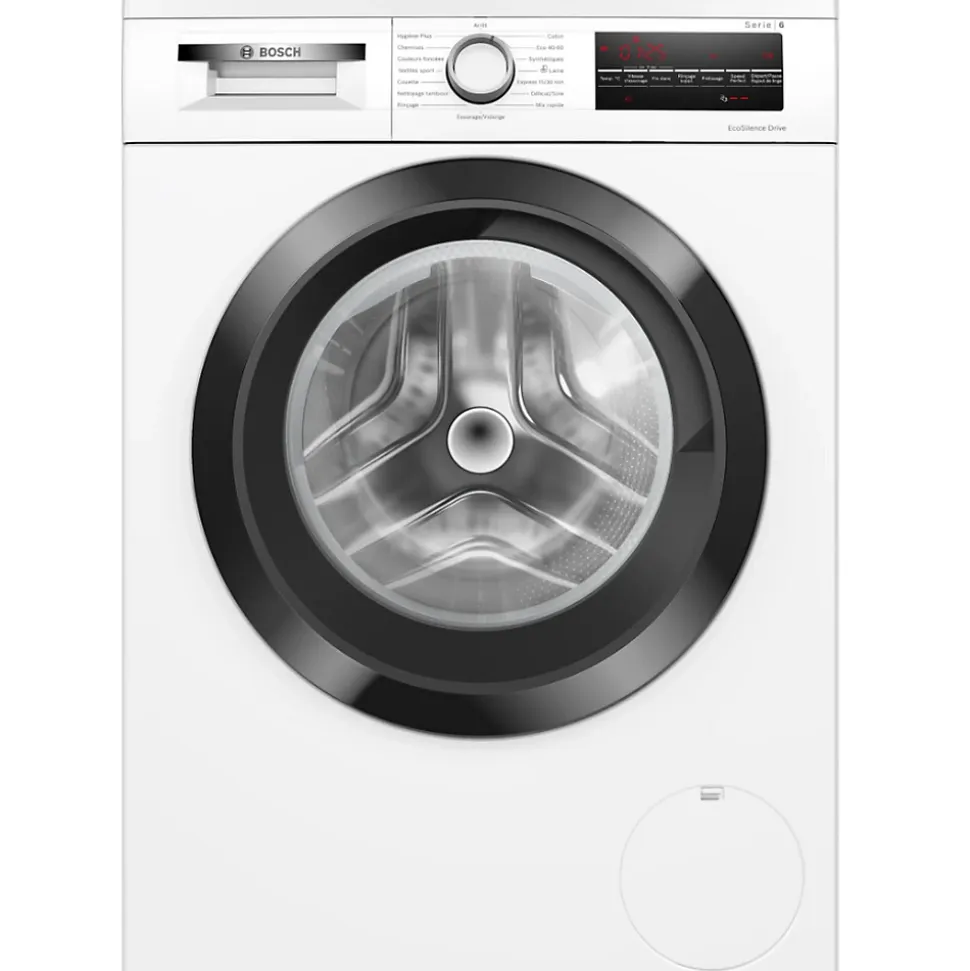 Lave-linge frontal 8kg 1400 tours/min Bosch – Lave-linge hublot Série 6 Bosch WUU28T18FR avec couvercle amovible – facilite l’encastrement- et moteur EcoSilence Drive™ : silence et robustesse garantis. Hauteur sans le couvercle : 82 cm. Moteur EcoSilence Drive™ : un moteur silencieux et économe en énergie garanti 10 ans. SpeedPerfect : un linge parfaitement propre avec des cycles jusqu’à 65 % moins longs. Hygiène Plus : lavage hygiénique éliminant les germes avec efficacité, même à 40°C. Tambour VarioDrum : soin des textiles garanti grâce à la structure unique du tambour. ActiveWater™Plus : la précision Bosch pour ne consommer que le strict minimum d’eau, adapté à la charge de linge. – Type de construction : Pose libre.Cet appareil est-il destiné à être encastré ? : Non.Type de commande : Electronique.Type de montage : Encastrable.Types de dispositifs de réglage et d’alarme : Affichage 7 segments, LCD, touche.Top amovible : Oui.Couvercle/Double porte : Non applicable.Niveau à bulle : Verre.Type de chargement : Chargement frontal.Charnière de la porte : À gauche.Couleur principale du produit : Blanc.Couleur de base du produit : Blanc.Roulettes : Non.Conçu(e) pour la libération d’ions argent (UE 2017/1369) : Non.Classe d’efficacité énergétique (UE 2017/1369) : A.Indice d’efficacité énergétique du cycle de lavage (UE 2017/1369) : 50.7.Consommation énergétique en kWh par kg par cycle du programme Eco 40-60 (UE 2017/1369) : 0.461 kWh/cycle.Température max. à l’intérieur du linge pendant le programme Eco 40-60 à mi-capacité (UE 2017/1369) : 27 °C.Température max. à l’intérieur du linge pendant le programme Eco 40-60 à un quart de la capacité (UE 2017/1369) : 23 °C.Température max. à l’intérieur du linge pendant le programme Eco 40-60 à la capacité nominale (UE 2017/1369) : 37 °C.Taux d’humidité résiduelle à la fin du programme Eco 40-60 à mi-capacité (UE 2017/1369) :