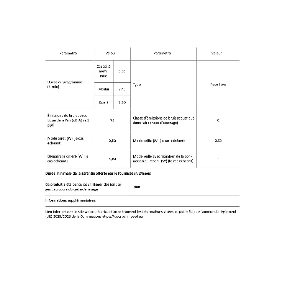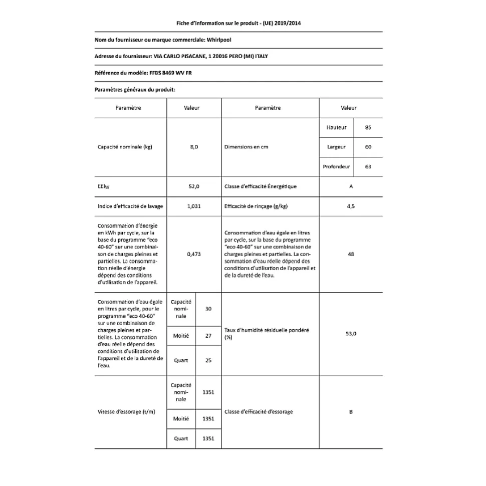 Lave-linge frontal 8kg 1400 tours/min Whirlpool – Lave-linge FFBS8469WVFR de Whirlpool avec la moteur Induction robuste, durable et silencieux qui réduit les vibrations et le niveau de bruit émis par l’appareil. Des performances optimales grâce à ses capteurs intelligents, il adapte la durée du cycle et la quantité d’eau à la charge de linge et à son type de fibre et permet de réaliser jusqu’à 50% d’économies d’eau, d’électricité et de temps****. 100% fraîcheur même si vous oubliez votre linge! Grâce à l’action combinée de la vapeur et dubrassage en fin de cycle, le système FreshCare+ préserve votre linge et le garde frais et sans odeur jusqu’à 6 heures après la fin du cycle**. Oubliez les odeurs et les plis en seulement 20 min ! Ce programme diffuse de la vapeur et régénère ainsi la fraîcheur de vos vêtements en évitant les lavages inutiles. Les odeurs désagréables disparaissent et les plis sont lissés. Vos vêtements sont prêts à porter en 20 min***. – Type de produit : Lave-linge frontal.Fonction séchage : Non.Type de chargement : Frontal.Capacité nominale programme Eco 40-60 (kg) : 8.IEE : 52.Classe d’efficacité énergétique : A.Indice d’efficacité de lavage : 1.031.Efficacité de rinçage (g/kg) : 4.5.Conso. d’énergie pondérée pour 100 cycles (kWh) : 47.Conso. d’énergie cycle lavage »Eco 40-60 » (kWh) : 0.473.Conso. d’eau pondérée par cycle (litres) : 48.Conso. eau cycle »Eco 40-60 » (L/cycle) : 50.Temp. max. (°C) à l’intérieur du textile traité (capacité nominale) : 30.Temp. max. (°C) à l’intérieur du textile traité (moitié) : 27.Temp. max. (°C) à l’intérieur du textile traité (quart) : 25.Taux d’humidité résiduelle pondéré (%) : 53.Vitesse d’essorage (t/min) : 1400.Classe d’efficacité d’essorage : B.Durée du programme »Eco 40-60 » capacité nominale (h:min) : 3:35.Durée du programme »Eco 40-60 » moitié (h:min) : 2:45.Durée du programme »Eco 40-60 » quart