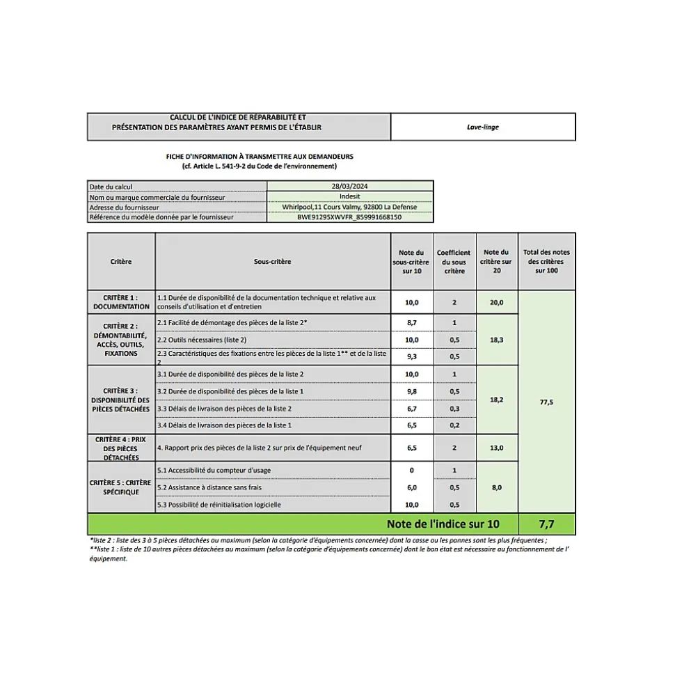 INDESIT – Lave linge hublot BWE 91295X WV FR – Pose libreCe lave linge hublot INDESIT BWE 91295X WV FR est un appareil à la fois performant et pratique pour laver votre linge en toute simplicité. Avec sa capacité de lavage de 9 kg, il vous permet de faire des lessives de grande taille en une seule fois. Sa vitesse d’essorage maximale de 1151 tr/min assure un linge bien essoré en un temps record. Grâce à sa classe énergétique B, il est économique en termes de consommation d’énergie et vous permet de réaliser des économies sur votre facture d’électricité. Son niveau sonore de 79 dba en lavage et en essorage est relativement silencieux pour un confort optimal lors de son utilisation. Avec des dimensions de 85 cm de hauteur, 60 cm de largeur et 63 cm de profondeur, il trouve facilement sa place dans votre espace. Ce lave linge hublot blanc est idéal pour une utilisation quotidienne à la maison.- Type de produit : lave linge hublot- Marque d’électroménager : INDESIT- Modèle de lave linge : BWE 91295X WV FR- Type de chargement : hublot- Type de pose : pose libre- Type de facette : lave linge- Classe énergétique : B- Hauteur : 85 cm- Largeur : 60 cm- Profondeur : 63 cm- Poids : 71 kg- Couleur : blanc- Capacité de lavage : 9 kg- Vitesse d’essorage maximale : 1151 tr/min- Qualité d’essorage : B- Séchant : Non- Indice de réparabilité : 7.7- Connecté : non- Intégrable : non- Fonction départ différé- Niveau sonore en lavage : 79 dba