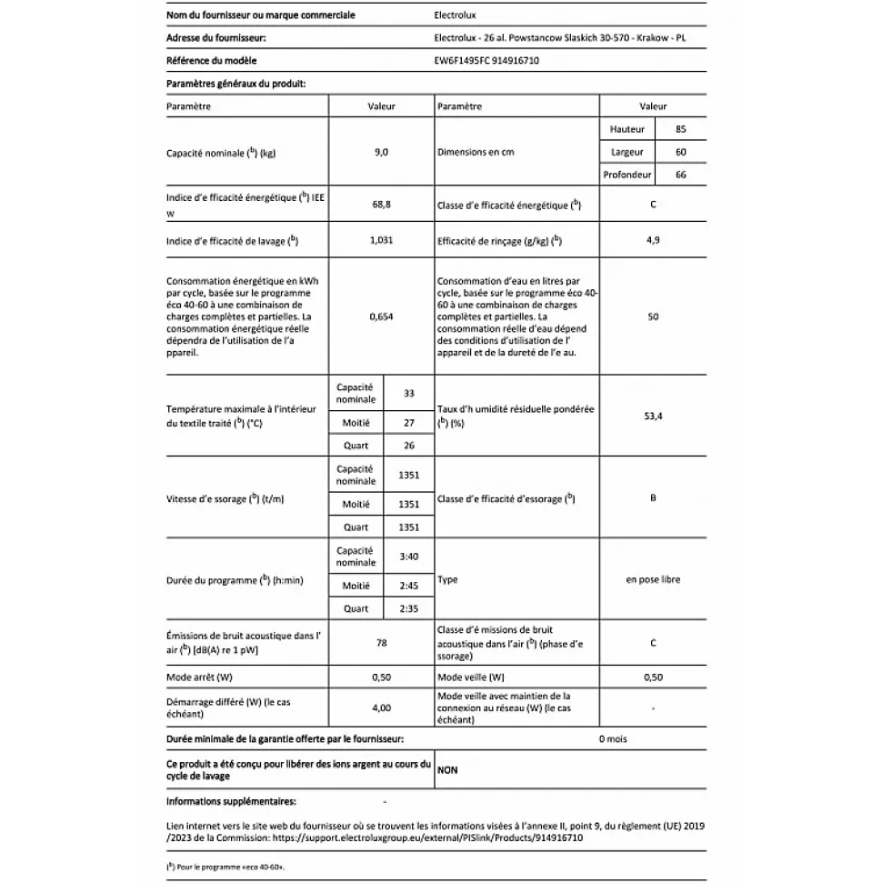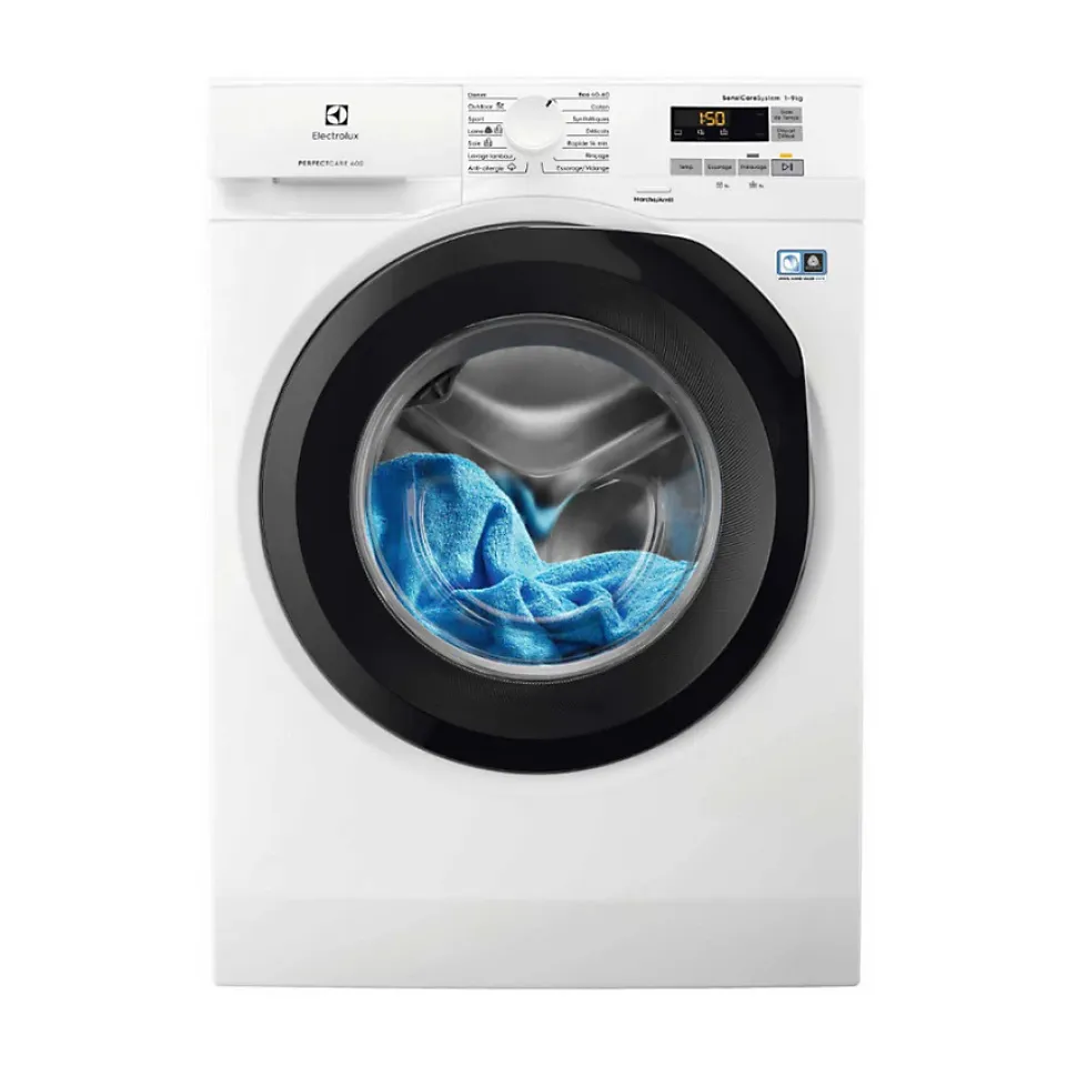Lave-linge frontal 9kg 1400 tours/min Electrolux – Lave-linge hublot PerfectCare 600 Electrolux EW6F1495FC pour laver avec soin votre linge au quotidien. Le système SensiCare ajuste la durée du programme en fonction de la charge. Il utilise la quantité d’eau, la durée et l’énergie idéales pour offrir un maximum de soin à vos vêtements qui garderont leur aspect neuf plus longtemps. Système SensiCare, des vêtements neufs deux fois plus longtemps : Ce système ajuste automatiquement les réglages du cycle de lavage à la charge dans le tambour afin d’éviter que vos vêtements ne soient lavés trop longtemps. Ainsi, ils conservent leur aspect et leur texture lavage après lavage. Lavez plus vite avec l’option Gain de temps : Cette option vous permet de réduire la durée du cycle de lavage pour du linge légèrement sale ou à rafraîchir. Vos cotons et synthétiques sont traités de la même manière, mais deux fois plus vite! Une lessive qui est propre quand vous le décidez : N’organisez plus votre journée en fonction de votre lessive. Avec la fonction Départ différé, vous pouvez reporter le début du prochain cycle de sorte qu’il sera prêt quand vous l’êtes. Aucun nettoyage de filtre nécessaire : Le système AutoClean filtre les particules provenant des cycles de lavage, ainsi vous n’aurez plus à nettoyer il le fait lui même. Les petits objets restant dans vos poches sont récupérés dans le double joint du hublot. Chargement et déchargement de votre linge facilités : Ce lave-linge de grande capacité dispose d’une ouverture extra large rendant son chargement et son déchargement bien plus pratiques, même pour les articles les plus encombrants, comme des duvets. – Type de produit : Lave-linge frontal.Gamme : PerfectCare 600.Fonction séchage : Non.Encastrable : Non.Type de chargement : Frontal.Capacité nominale programme Eco 40-60 (kg) : 9.IEE : 68.8.Classe d’efficacité énergétique : C.Indice d’efficacité de lavage : 1.031.Efficacité de
