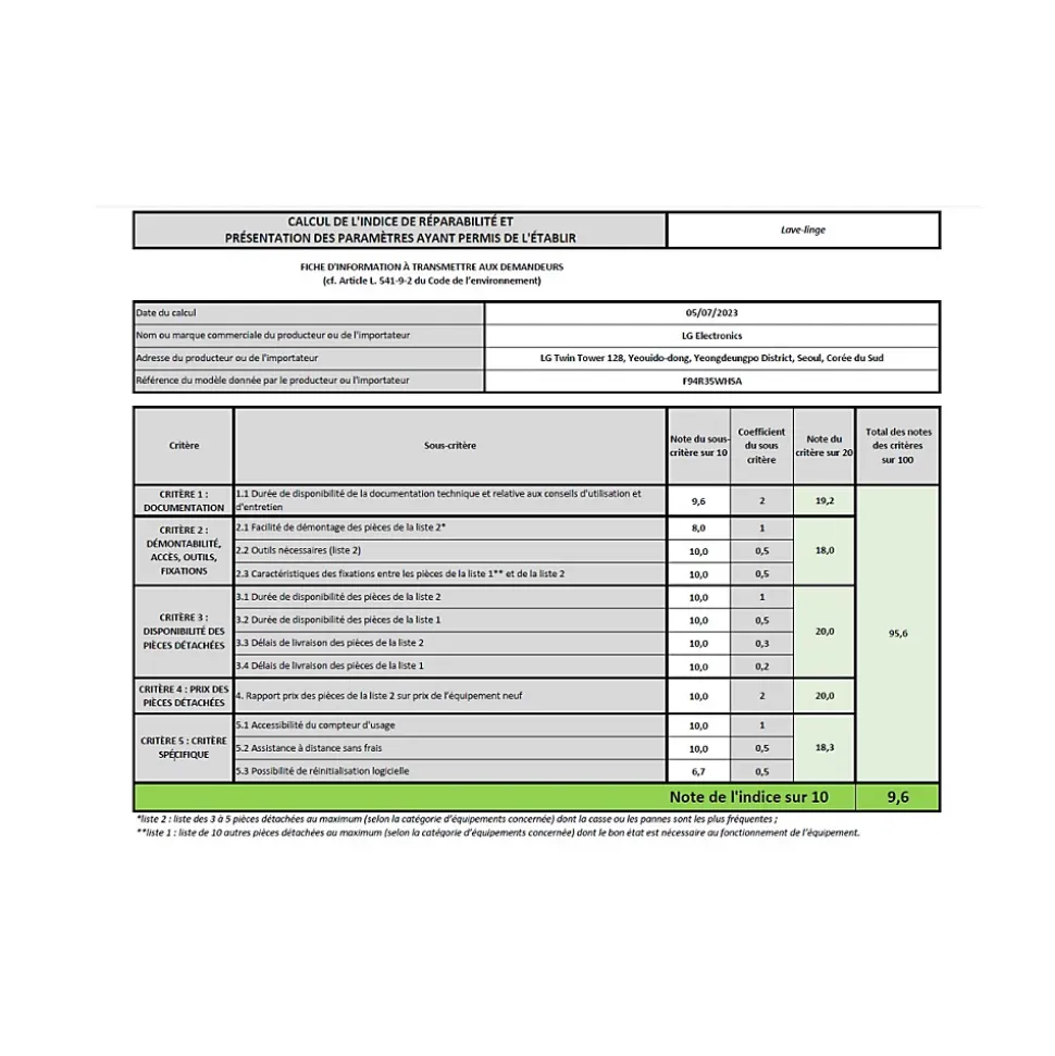 Lave-linge frontal 9kg 1400tours/min Lg – Découvrez le lave-linge 9 kg LG F94R35WHSA, l’alliance parfaite entre performance et technologie. Grâce à son moteur AI Direct Drive™, ce lave-linge adapte intelligemment les mouvements du tambour selon le type de textile et la charge, offrant ainsi un soin du linge optimisé et une réduction de l’usure prématurée. Avec une capacité de 9 kg, ce lave linge est idéal pour les familles nombreuses. Le moteur Inverter Direct Drive assure une transmission directe au tambour, réduisant ainsi les risques de panne et les bruits de friction. Grâce à ses 6 mouvements de tambour uniques, la machine à laver Lg propose un lavage adapté à chaque type de tissu, garantissant une propreté impeccable à chaque cycle. Avec le système de dosage automatique Ez Dispense™, fini le gaspillage de détergent. Ce système distribue la quantité précise de produit lessiviel selon la charge et le type de textile, pouvant stocker jusqu’à 1,5 litre de détergent pour environ 35 cycles de lavage. Une solution pratique et économique pour une lessive toujours parfaite. Le TurboWash™ permet un lavage rapide sans compromettre la qualité. En seulement 39 minutes, vos vêtements sont impeccablement propres grâce aux 4 jets sous pression qui aspergent le linge, réduisant ainsi la consommation d’énergie et d’eau. Le lave linge LG F94R35WHSA est équipé de la fonction vapeur Anti-Allergie. Ce cycle est idéal pour les peaux sensibles et les personnes souffrant d’allergies. – Type de produit: Lave-linge.Type de pose : Pose libre.Chargement : Frontal.Consommation électrique par 100cycles (kWh) : 45.Éco 40-60 pleine charge : 0,670.Classe d’efficacité énergétique : A.Vitesse d’essorage maximale (tr/min) : 1 360.Niveau sonore essorage (dBA) : 71.Classe d’efficacité d’essorage : A.Temps (min)-pleine charge : 228.Temps (min) -demi-charge : 174.Temps (min)-quart de charge : 142.Capacité de lavage (kg) : 9,0.Temps