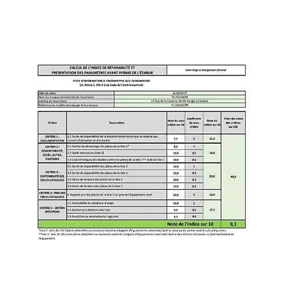 Affichage du temps restant : OuiAutre(s) : Sécurité porteAutre(s) équipement(s) : Filtre de pompe en façade, Pieds réglables, Joint filtre entrée d’eau + tuyau d’arrivée d’eauCapacité de lavage (kg) : 10Capacité nominale programme Eco 40-60 (kg) : 10Classe d’efficacité d’essorage : BClasse d’efficacité de lavage : AClasse d’efficacité énergétique : AClasse d’émission de bruit (en essorage) : 75Classe d’émission de bruit acoustique dans l’air : BConso. d’eau pondérée par cycle (litres) : 52Conso. d’énergie cycle lavage »Eco 40-60 » (kWh) : 0.514Conso. d’énergie pondérée pour 100 cycles (kWh) : 51Conso. eau cycle »Eco 40-60 » (L/cycle) : 52Conso. énergie /100 cycles (kWh) : 51Couleur : NoirDémarrage différé (W) : 4Départ / Pause : OuiDépart différé : OuiDépart ou fin différé(e) : Départ différéDimensions (cm) : 84.5 x 59.7 x 58.2Durée cycle »Eco 40-60 » (h:min) : 3:59Durée du programme »Eco 40-60 » capacité nominale (h:min) : 3:59Durée du programme »Eco 40-60 » moitié (h:min) : 3:00Durée du programme »Eco 40-60 » quart (h:min) : 3:00Eclairage du tambour : NonEcran : OuiEfficacité de rinçage (g/kg) : 5Emissions de bruit acoustique dans l’air (dB(A)) : 75Encastrable : NonFin différée : NonFonction séchage : NonHauteur (cm) : 84.5IEE : 52Indice d’efficacité de lavage : 1.04Indice de réparabilité (Note /10) : 9.1Largeur (cm) : 59.7Lave-linge connecté : NonMatériau / type tambour : InoxMatériau cuve : PlastiqueMode arrêt (W) : 0.5Mode veille (W) : 1Nbre de programmes : 15Niveau sonore lavage (dB) : N/CNiveau sonore max.(dB) : 50Poids (kg) : 73.5Profondeur (cm) : 58.2Rinçage plus : OuiSécurité anti-balourd : OuiSécurité anti-débordement : OuiTaux d’humidité résiduelle pondéré (%) : 53.4Temp. max. (°C) à l’intérieur du textile traité (capacité nominale) : 41Temp. max. (°C) à l’intérieur du textile traité (moitié) : 26Temp. max. (°C) à l’intérieur du textile traité (quart) : 23Touches sensitives : OuiTouches spéciales : VapeurType : Lave-linge frontalType d’affichage :