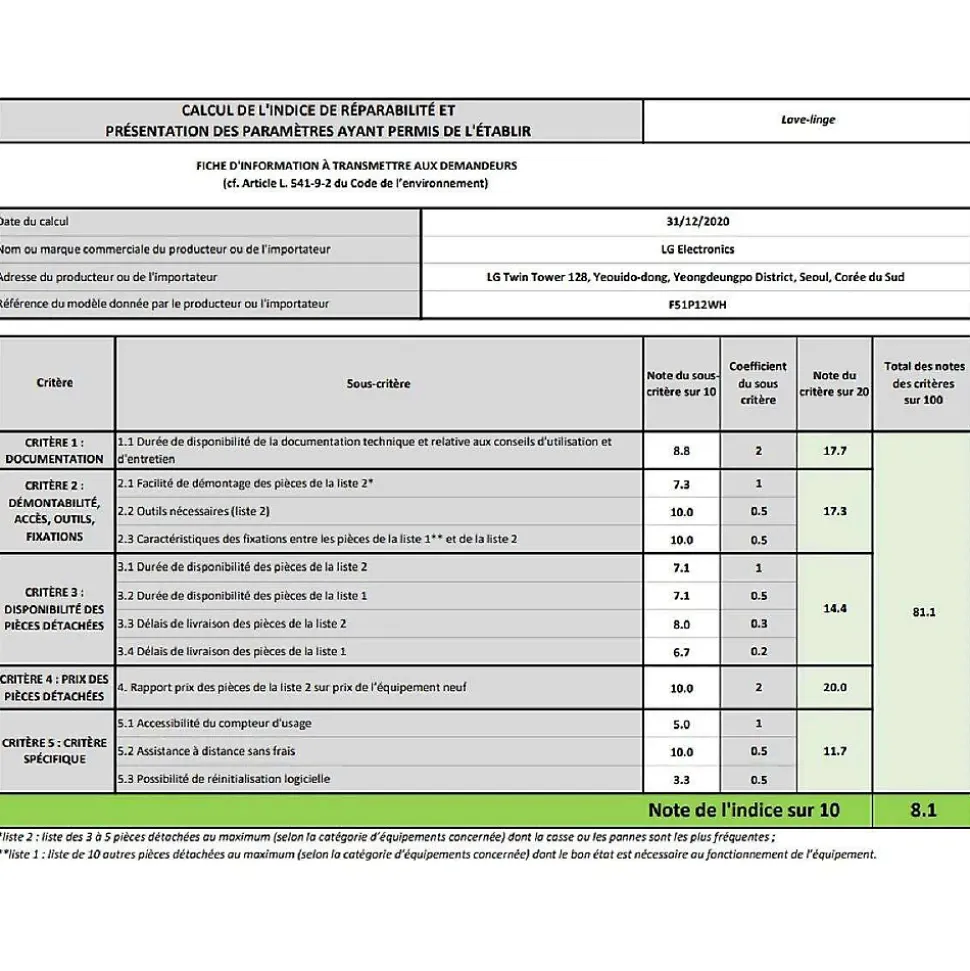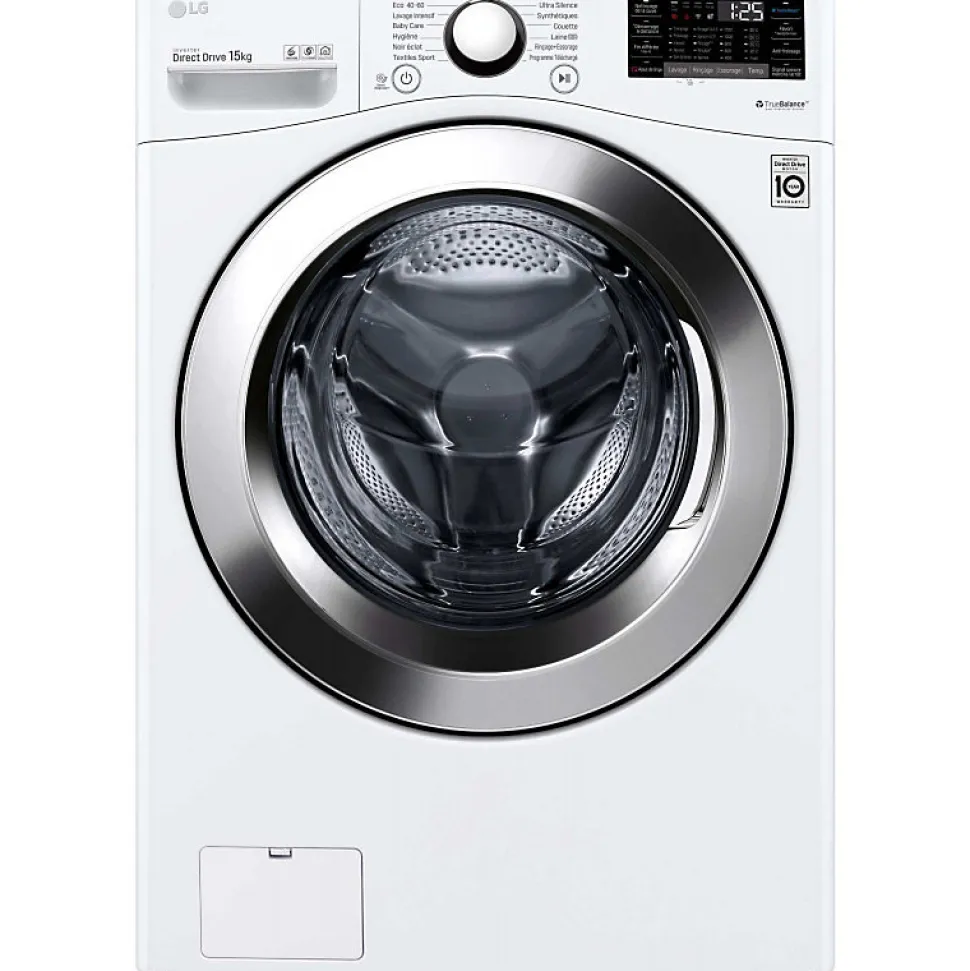 Lave-linge frontal 15 kg 1100 tours/min Lg – Lave-linge frontal LG F51P12WH doté de 14 programmes dont TurboWash 39 min + jusqu’à 26 programmes téléchargés. Options Ajout de linge, Prélavage, Intensif, TurboWash, Anti-froissage, Favori et Rinçage+. La technologie AI Direct Drive détecte la typologie de matière, de manière autonome afin d’optimiser le cycle de lavage et d’essorage. La technologie 6 Motion Direct Drive recrée jusqu’à six mouvements de tambour au cours d’un même cycle de lavage pour un résultat irréprochable, adapté à tout type de tissu. Le moteur induction Direct Drive garanti 10 ans vous assure une fiabilité maximum et un lavage silencieux. Tambour XXL 127 litres : lavez facilement vos couettes, oreillers et draps de lit. La fonction Smart Diagnosis permet de détecter les pannes potentielles ou mauvaises utilisations de votre lave-linge. Connectivité WiFi : Contrôle à distance + téléchargement de programmes + Analyse de la consommation énergétique. – Type de produit : Lave linge frontal.Capacité nominale pour le programme »coton » standard à 60°C ou 40°C à pleine charge (kg) : 15.Vitesse d’essorage max. (trs/min) : 1100.Programmes »coton » : Le programme coton standard à 60°C et le programme coton standard à 40°C sont les programmes de lavage standard auxquels se rapportent les informations qui figurent sur l’étiquette et sur la fiche. Ces programmes conviennent pour nettoyer du linge en coton normalement sale. Ces programmes sont les plus efficaces en termes de consommation combinée d’eau et d’énergiee programmes conviennent pour nettoyer du linge en coton normalement sale et qu’il s’agit des programmes les plus effiicaces en termes de consommation combinée d’eau et d’énergie.Durée du programme »coton » standard 60° à pleine charge (min.) : 241.Durée du programme »coton » standard 60° à demi-charge (min.) : 214.Durée du programme »coton » standard 40° à demi-charge (min.) : 184.Durée du mode laissé sur