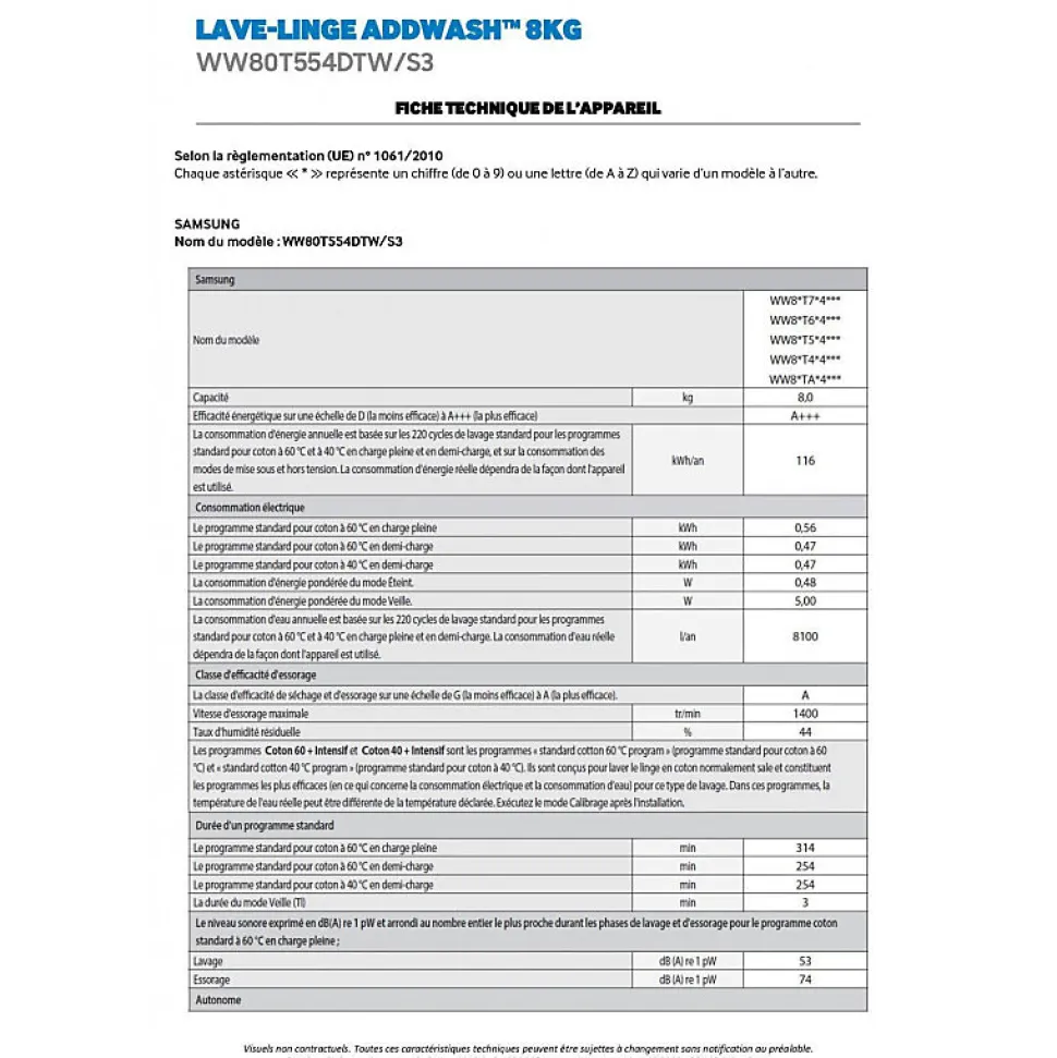 8kg (61L) – 1400t – B – 72dB – Digital Inverter- Ecobubble- vapeur – AddWash – Wifi – hublot blanc – blanc
