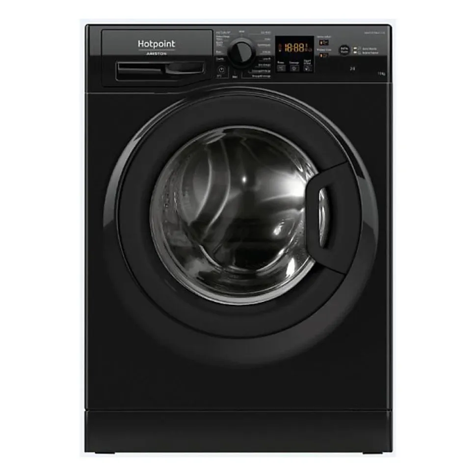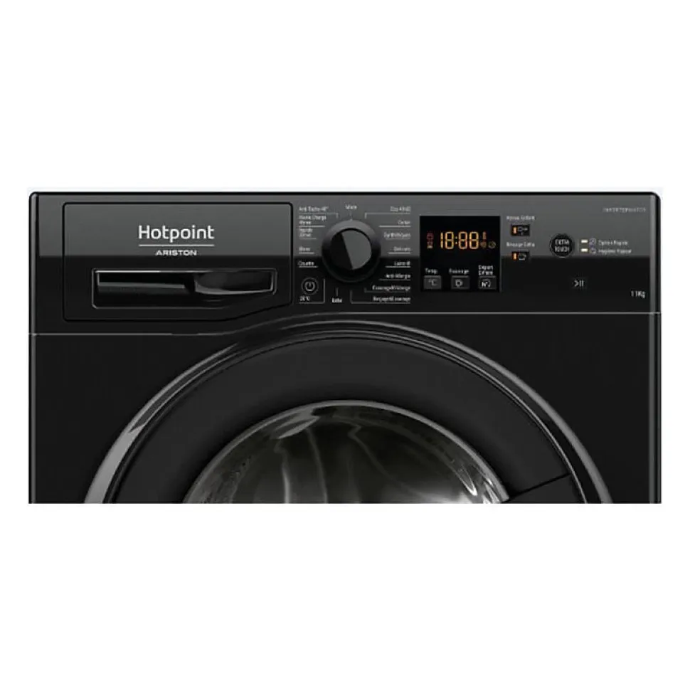Lave-linge frontal HOTPOINT NS11469FBKFR 11 kg, moteur à induction silencieux, essorage 1400 trs/min, classe A, technologie Steam Pack pour fraîcheur et hygiène, 16 programmes, grande capacité et options pratiques (départ différé, rinçage extra, verrou enfant). Dimensions H85 x L59,5 x P60,5 cm.
