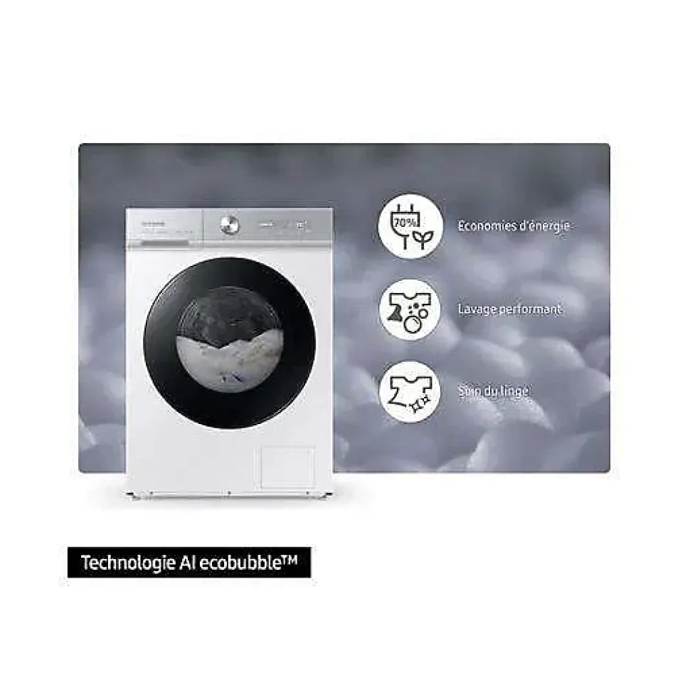 Samsung – WW11DG6B25LE – Lave-Linge HublotCe lave-linge hublot de la marque Samsung, modèle WW11DG6B25LE, offre une capacité de lavage généreuse de 11 kg. Doté d’une vitesse d’essorage maximale de 1400 tr/min, il garantit un lavage efficace et rapide. Avec sa classe énergétique A, ce lave-linge est à la fois performant et économe en énergie.Caractéristiques du produit :- Type de produit : lave-linge hublot- Marque d’électroménager : Samsung- Modèle de lave-linge : WW11DG6B25LE- Type de chargement : hublot- Type de pose : pose libre- Capacité de lavage : 11 kg- Vitesse maximale d’essorage : 1400 tr/min- Qualité d’essorage : B- Niveau sonore : 72 dba- Niveau sonore en essorage : 72 dba- Fonction connectée : oui- Départ différé : sans départ différé- Hauteur : 85 cm- Largeur : 60 cm- Profondeur : 60 cm- Séchant : Non- Intégrable : NonCe lave-linge Samsung WW11DG6B25LE propose une grande capacité de lavage de 11 kg, idéale pour les familles nombreuses ou les gros volumes de linge. Son essorage à 1400 tr/min permet un séchage plus rapide. Grâce à sa classe énergétique A, il consomme moins d’électricité tout en offrant des performances exceptionnelles. Sa fonction connectée offre une utilisation pratique et moderne, tandis que son design hublot et sa pose libre facilitent son installation dans votre espace de lavage. Profitez d’un lave-linge performant et efficace avec le Samsung WW11DG6B25LE