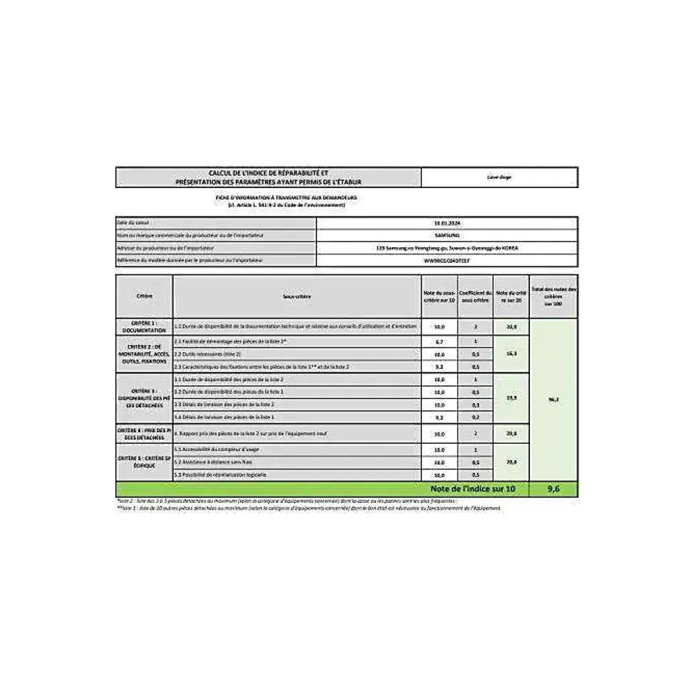 Samsung – WW90CGC04DTE – Lave-linge hublot 9 kg 1400 tr/minCe lave-linge hublot Samsung modèle WW90CGC04DTE, de couleur blanche, est un appareil de haute qualité qui allie performance et praticité pour une expérience de lavage optimale. Doté d’une capacité de lavage de 9 kg, il vous permet de laver de grandes quantités de linge en une seule fois, idéal pour les familles nombreuses. Sa vitesse d’essorage maximale de 1400 tr/min garantit un linge propre et bien essoré en un temps record, pour un séchage plus rapide. Grâce à sa classe énergétique A, ce lave-linge vous permettra de réaliser des économies d’énergie tout en bénéficiant d’une performance de lavage optimale.- Type de produit: lave linge hublot- Marque: Samsung- Modèle: WW90CGC04DTE- Type de chargement: hublot- Type de pose: pose libre- Type de facette: lave linge- Classe énergétique: A- Hauteur: 85 cm- Largeur: 60 cm- Profondeur: 55 cm- Poids: 65 kg- Capacité de lavage: 9 kg- Vitesse maximale d’essorage: 1400 tr/min- Qualité d’essorage: B- Séchant: Non- Indice de réparabilité: 9.6- Connecté: Oui- Intégrable: Non- Départ différé: Fin différée- Niveau sonore: 72 dba- Niveau sonore d’essorage: 72 dbaNe manquez pas l’occasion d’acquérir ce lave-linge Samsung performant, pratique et connecté, pour un lavage de qualité et un soin optimal de votre linge au quotidien