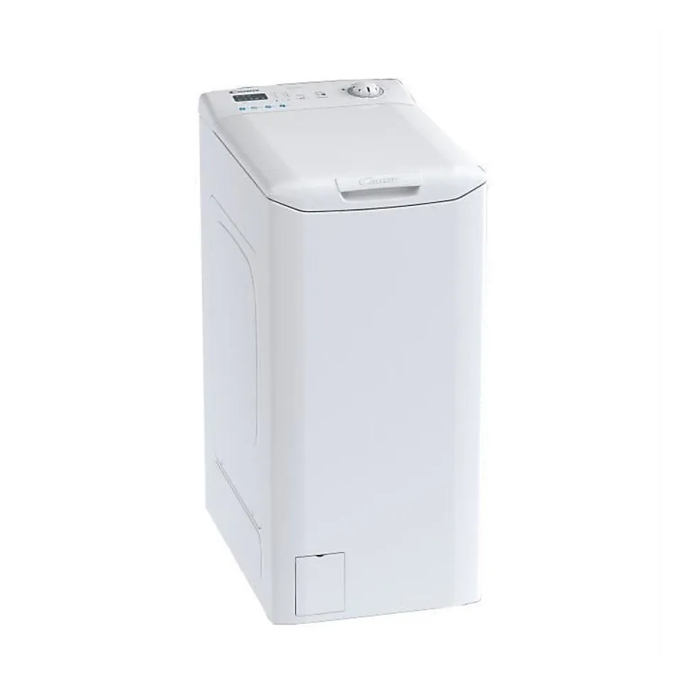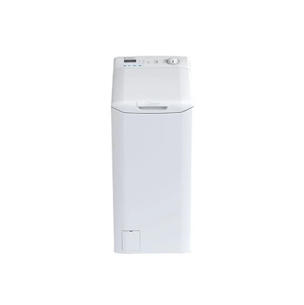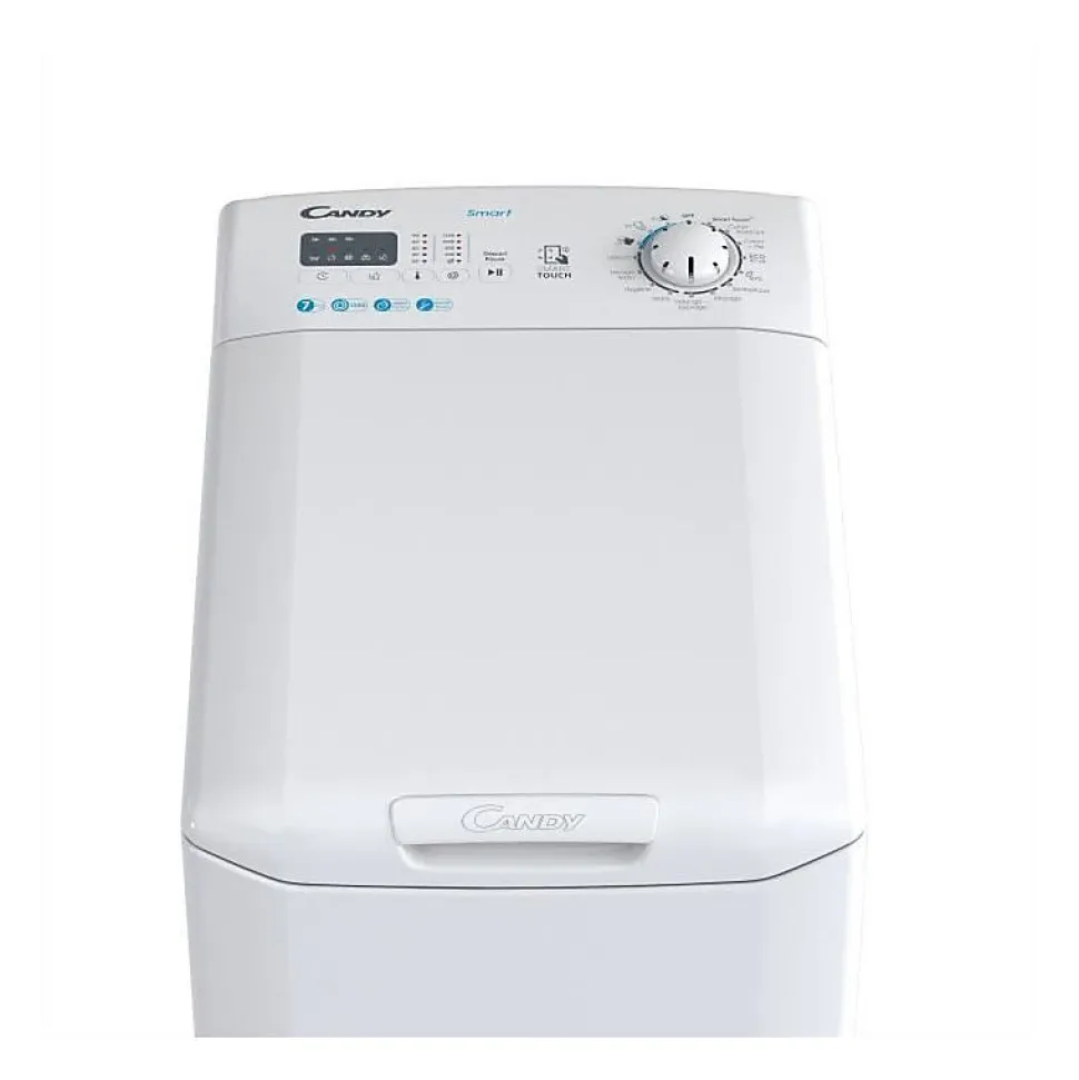 Lave-linge top Candy compact 7 kg, 1200 tr/min, classe énergétique C, 17 programmes, tambour inox et connectivité Candy Simply‑Fi pour un contrôle via smartphone.
