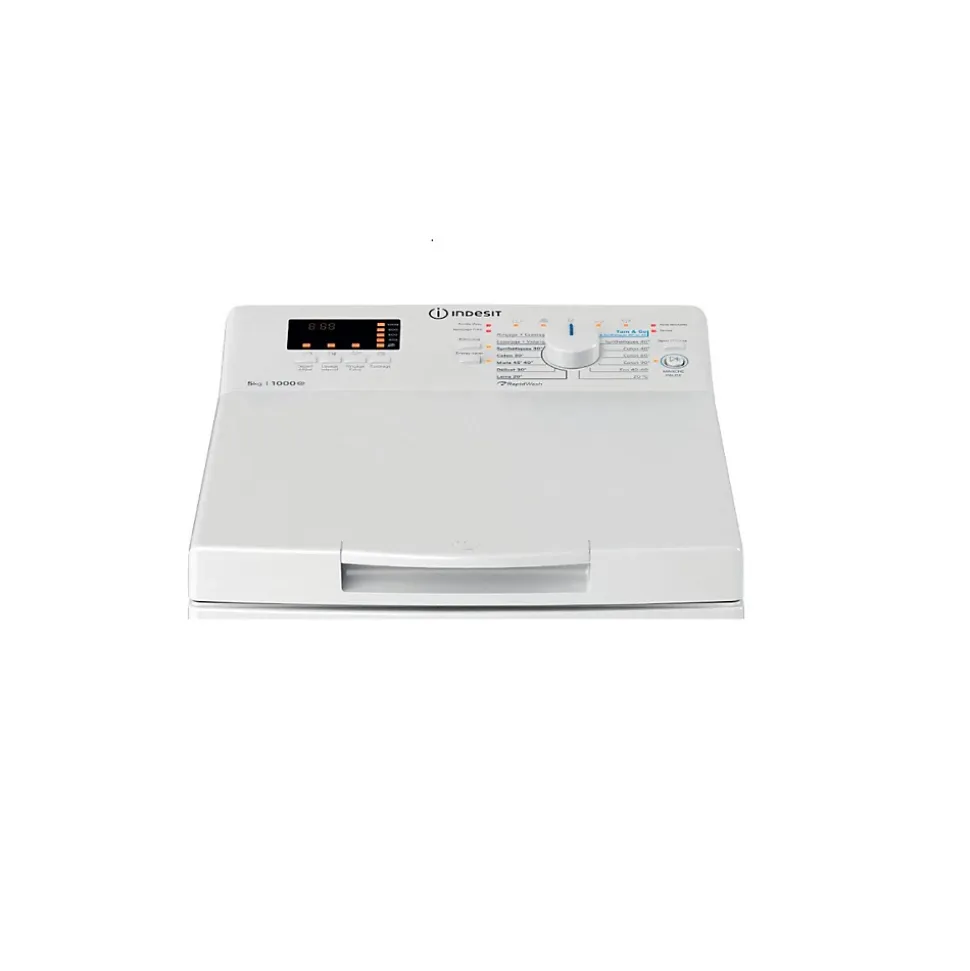 Lave-linge top 5kg 1000 tours/min Indesit – Lave-linge top BTWS50400FR de la marque Indesit.Turn&go : La simplicité.Un seul tour suffit pour démarrer votre programme quotidien Mix 30° en seulement 45min !Rapidwash : La rapidité.Les 5 premiers programmes quotidiens durent moins d’1 heure ! Et si votre linge est vraiment très sale, sélectionnez l’option Lavage.Intense afin d’accroître la durée du cycle et d’éliminer les taches les plus tenacesUne simplicité d’utilisation :Le bac à lessive amovible et l’accès direct à la pompe à vidange permet un nettoyage facile des résidus lessiviels et du filtre. – Type de produit : Lave-linge top.Capacité de chargement (kg) : 5.Vitesse d’essorage (tours/min) : 1000.Tambour Inox : 42 L.Puissance de chauffage : 2100 W.Alimentation électrique : 220-230 V – 50 Hz.Fusible (en ampères) : 10.Capacité Variable Automatique : Oui.Indicateur de déroulement du cycle : Small Digit.Moteur : Universel.Classe d’efficacité énergétique : C.Consommation pondérée d’énergie (KWh / 100 cycles) : 52.Consommation d’eau programme Eco 40-60 (L /cycle) : 40.Classe d’efficacité d’essorage : C.Niveau d’émission sonore en essorage (dB) : 76.Classe sonore en essorage : B.Départ différé0-24h : Oui.Energy Saver : Oui.visuel non contractuel Prélavage : Oui.Lavage Intensif : Oui.Rinçage Extra : Oui.Essorage : Oui.Reset Vidange : Oui.Dimensions nettes en cm (HxLxP) : 90 x 40 x 60.Poids (en kg) net : 53.
