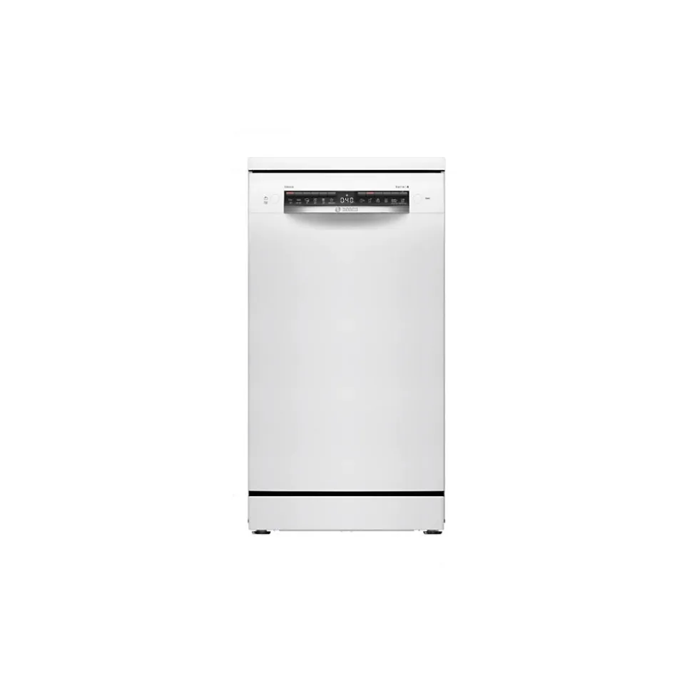 Lave-vaisselle 10 couverts 45db blanc Bosch – Le lave-vaisselle Série 4 SPS4EMW61E de Bosch, dispose d’une capacité de 10 couverts et possède 6 programmes : Eco 50 °C, Auto 45-65 °C, Intensif 70 °C, Programme 1h 65 °C, Silence 50 °C, Favourite (Pré-rinçage) et 4 options : Home Connect, EfficientDry, Zone Intensive, SpeedPerfect+ qui permet de laver votre vaisselle 3 fois plus rapidement.Il est équipé d’un moteur EcoSilence Drive qui rend cet appareil encore plus silencieux avec ses 45 décibels et qui garantit une plus grande performance énergétique.Il offre une performance de séchage améliorée, Efficient Dry, grâce à l’ouverture de porte automatique en fin de cycle et comprend un tiroir Vario Slimline pour vos couverts, ustenciles, ainsi qu’un panier supérieur Rackmatic, ajustable en hauteur.De plus, il est doté d’une connectivité intelligente afin de faciliter votre quotidien même à distance en toute sérénité. – Type de produit : Lave-vaisselle.Type de construction : Pose libre.Gamme : Série 4.Nombre de couverts : 10.Perception sonore (en dB) (2021) : 45.Classe de perception sonore (2021) : C.Classe énergétique (2021) : D.Consommation d’eau pour un cycle (2021) : 6.7.Consommation d’énergie (kWh/100 cycles) (2021) : 67.Moteur EcoSilence Drive : Oui.Tiroir à couverts : Oui.Efficient Dry : Oui.SpeedPerfect+ : Oui.Home connect : Oui.Sécurité enfants : Oui.Tout intégrable : Non.Top amovible : Oui.Durée du cycle (2021) : 4:14.Indice de réparabilité : 8.8.Nombre de programmes : 6.Nombre de températures : 4.Départ différé : Oui.Ecran : Display Inscriptions En Texte Clair.Affichage temps restant : Oui.Mode de séchage : Inscriptions En Texte Clair.Programme rapide : Variospeed Plus.Tiroir à couverts : Oui.Couleur : Blanc.Couleur du bandeau : Blanc.Dimensions (LxHx ) : 45 x 84.5 x 60 cm.Poids (en Kg) :