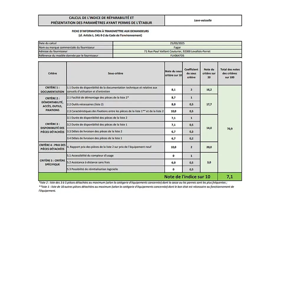 Lave-vaisselle 45cm 6 couverts 47db Fagor – Lave-vaisselle pose libre de Fagor FLV0647DS compact. Ouverture de porte automatique en fin de cycle. Pour une vaisselle parfaitement sèche. Lance le cycle quand vous le souhaitez. – Type de produit : Lave-vaisselle.Type de construction : Pose libre.Grande hauteur : Non.Nombre de couverts : 6.Classe énergétique : D.Niveau sonore (dB) : 47.Classe de niveau sonore : C.Conso. énergie /100 cycles (kWh) : 49.Conso. eau /cycle (L) : 6.5.Lave-vaisselle connecté : Non.Ouverture automatique de la porte : Oui.Nbre de programmes : 7.Nbre températures : 5.Indice de performance de lavage : 1.125.Indice de performance de séchage : 1.065.Conso. d’énergie par cycle en programme éco (kWh) : 0.494.Conso. d’eau par cycle en programme éco (L) : 6.5.Conso. d’énergie pour 100 cycles (kWh) : 49.Durée du programme éco (h:min) : 3:35.Mode veille (W) : 0.49.Démarrage différé (W) : 1.Intensif : Oui.Rapide : Oui.Délicat : Oui.Eco : Oui.Programmes spéciaux : Universel, 90 min, Auto-nettoyant.Départ différé : Oui.Type de départ différé : 1-24 h.Ecran : Oui.Type d’affichage : Voyants LED.Voyant niveau de sel : Oui.Voyant niveau liquide de rinçage : Oui.Top amovible : Non.Eclairage intérieur : Non.Hauteur de panier réglable : Non.Tiroir à couverts : Non.Signal sonore de fin de cycle : Oui.Autre(s) équipement(s) : 1 panier, 1 bras d’aspersion.Autre(s) accessoire(s) : Panier à couverts.Sécurité enfant : Oui.Indice de réparabilité (Note /10) : 7.1Couleur : Silver.Hauteur (cm) : 43.8.Largeur (cm) : 55.Profondeur (cm) : 50.Poids (kg) : 21.