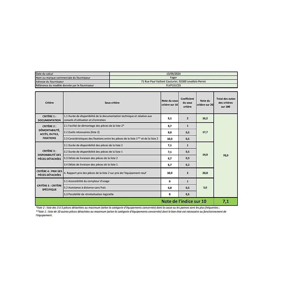 Affichage du temps restant : OuiAutre(s) équipement(s) : 3 bras d’aspersionClasse d’efficacité énergétique : CClasse d’émission de bruit acoustique dans l’air : BClasse de niveau sonore : BClasse énergétique : CConso. d’eau annuelle (L/an) : N/CConso. d’eau par cycle en programme éco (L) : 11Conso. d’énergie par cycle en programme éco (kWh) : 0.757Conso. d’énergie pour 100 cycles (kWh) : 76Conso. eau /cycle (L) : 11Conso. énergie /100 cycles (kWh) : 76Construction : Pose libreCouleur : InoxDémarrage différé (W) : 1.00Départ différé : OuiDurée du programme éco (h:min) : 4:07Ecran : OuiEmissions acoustiques dans l’air dB(A) re 1 pW : 42Grande hauteur : NonHauteur (cm) : 83.5Hauteur de panier réglable : OuiIEE : 43.9Indice de performance de lavage : 1.121Indice de performance de séchage : 1.061Indice de réparabilité (Note /10) : 7.1Largeur (cm) : 60Largeur lave-vaisselle : 60 cmLave-vaisselle connecté : NonMode arrêt (W) : 0.49Mode veille (W) : 0.60Nbre de programmes : 6Nbre températures : 5Niveau sonore (dB) : 42Nombre de couverts : 15Nombre de couverts standard : 15Ouverture automatique de la porte : OuiPoids (kg) : 44Profondeur (cm) : 60Sécurité enfant : OuiTiroir à couverts : OuiType : Lave-vaisselle 60 cmType d’affichage : Display LEDType de départ différé : 1-24 hVoyant niveau de sel : OuiVoyant niveau liquide de rinçage : Oui