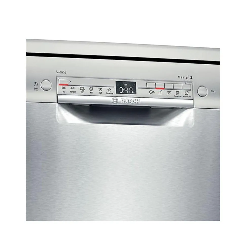 Lave-vaisselle Bosch SMS2HTI79E avec capacité 12 couverts, 6 programmes, technologie Home Connect, système de séchage par échangeur de chaleur, consommation économe, et design inox anti-trace.