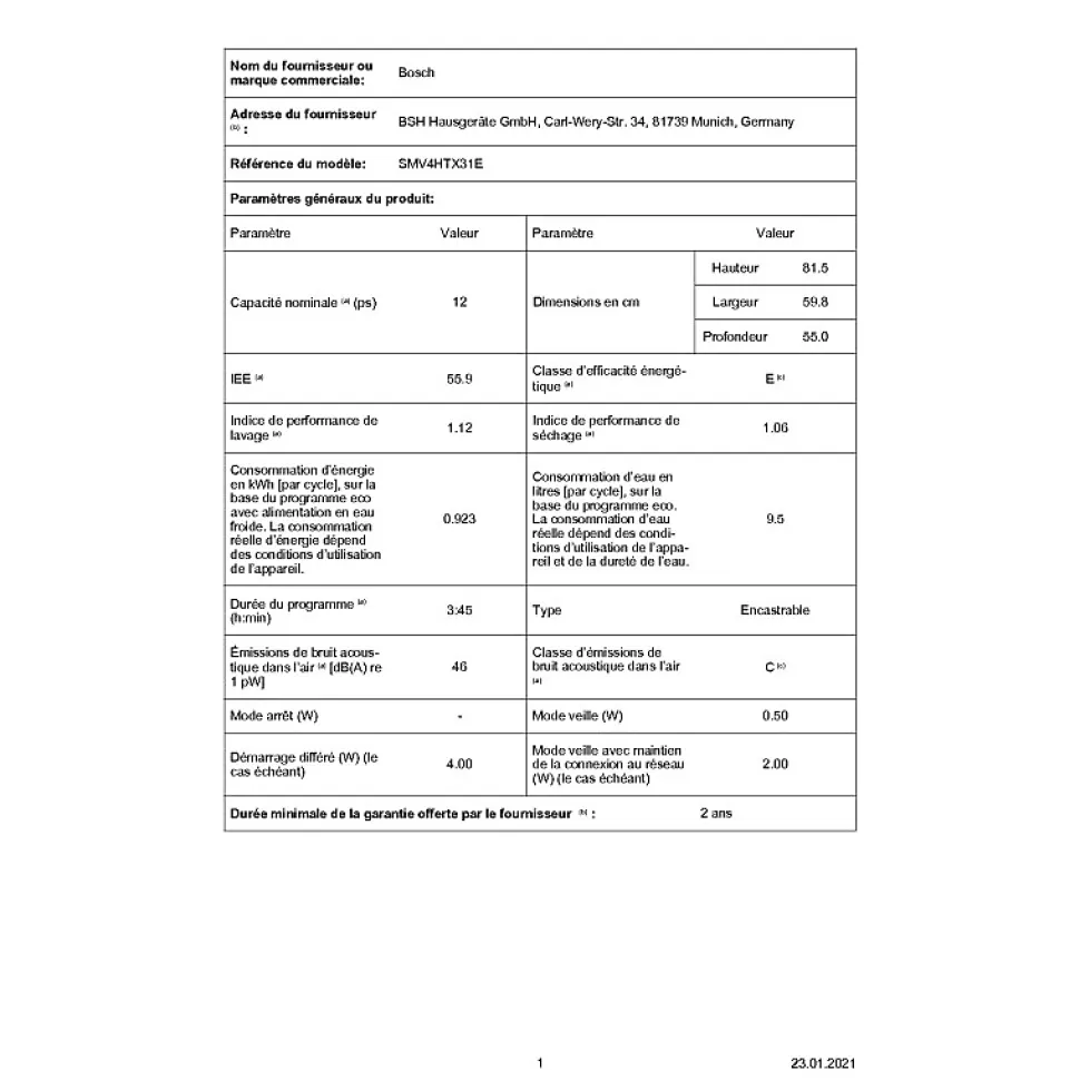 Lave-vaisselle 60cm 12 couverts 46db tout intégrable Bosch – Lave-vaisselle intégrable Série 4 Bosch SMV4HTX31E. Chargement flexible et contrôle intelligent de votre lave-vaisselle via l’application Home Connect. Home Connect : appareils électroménagers dotés d’une connectivité intelligente pour une vie quotidienne facilitée. Option Séchage Extra : une phase de séchage plus longue pour un résultat optimal sur la vaisselle difficile à sécher comme le plastique. Programme Silence : la façon la plus silencieuse d’utiliser votre lave-vaisselle.Paniers Vario : flexibilité accrue pour le rangement de votre vaisselle.Système Rackmatic : panier supérieur ajustable en hauteur jusqu’à 5 cm sur 3 positions différentes, même complètement chargé. – Type de produit : Lave-vaisselle.Construction : Tout intégrable.Nombre de couverts standard : 12.Classe énergétique : E.Classe d’efficacité de séchage : A.Niveau sonore : 46 dB.Classe de niveau sonore : C.Conso. énergie /100 cycles : 92 kWh.Conso. eau /cycle : 9.5 L.Conso. d’eau annuelle : 2660 L/an.Lave-vaisselle connecté : Oui.Optimisation du lavage : Aqua Sensor.Capacité variable automatique : Oui.Type de séchage : Chaleur propre.Programmateur électronique : Oui.Couleur : Blanc.Nbre programmes : 6.Intensif : Oui.Eco : Oui.Programmes spéciaux : Auto, Programme 1h,Silence,Favourite (Pré-rinçage), Home connect.Départ différé : Oui.Type de départ différé : 1-24h.Demi-charge : Oui.Touches spéciales : Home connect, Séchage extra, Demi-charge, VarioSpeed Plus (3 fois plus rapide), Machine Care, Silence à la demande (Via Home Connect).Ecran : Oui.Affichage du temps restant : Oui.Top amovible : Sans top.Porte à habiller : Oui.Porte d’habillage fournie : Non.Matériau de la cuve : Polinox.Eclairage intérieur : Non.Hauteur de panier réglable : Oui.Tiroir à couverts : Non.Type