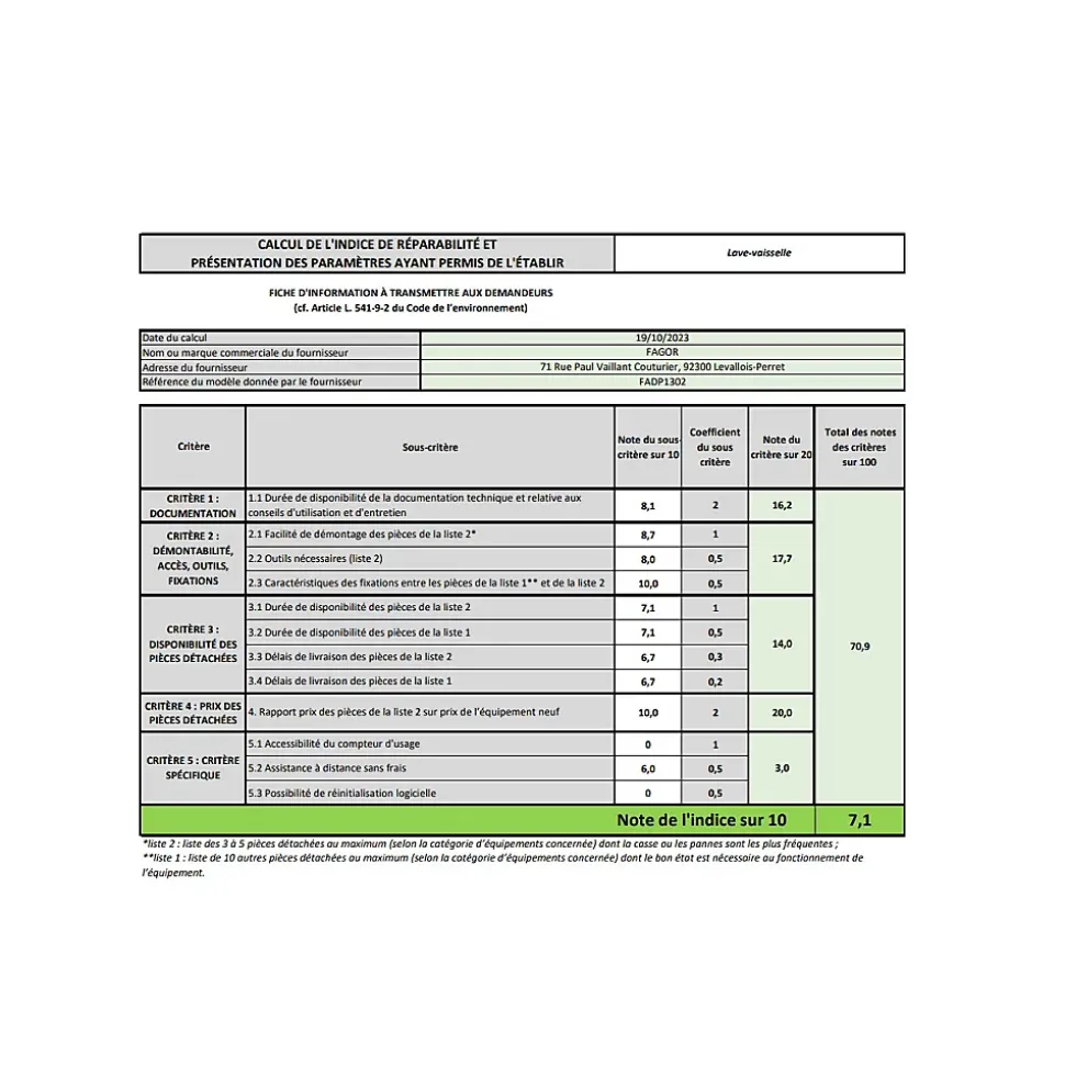 Lave-vaisselle 60cm 13 couverts 47 db Fagor – Lave-vaisselle FADP1302 de Fagor – Type de produit : Lave-vaisselle.Nombre de couverts : 13.Nombre de programmes : 6.Températures de lavage : 5.Départ différé : 3/6/9/12h.Type d’affichage : LED.Ecotaxe : 8.Type de commande : Boutons.Fonction demi-charge : Oui.Signal sonore en fin de cycle : Oui.Voyant liquide de rinçage : Oui.Indicateur de sel : Oui.Sécurité enfant : Oui.Classe énergétique : E.Consommation électrique (arrêt) : 0.49 W.Consommation d’eau: 11 L/Cycle.Niveau sonore : 47 dB.Classe sonore : C.Demi-charge : Oui.Indice de réparabilité : 7.1/10.Dimensions HxLxP : 84.5 x 59.8 x 61 cm.Paniers : 2.Panier à couverts : 1.Bras d’aspersion : 2.Pieds réglables : 4.Top amovible : Oui.Largeur : 59.8 cm.Hauteur : 84.5 cm.Profondeur : 60 cm.Poids du paquet : 48.2 kg.