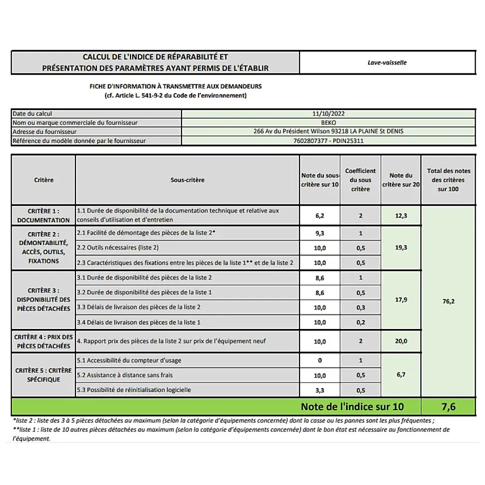 Lave-vaisselle 60cm 13 couverts 47db tout intégrable Beko – Lave-vaisselle PDIN25311 BEKO.Programme Quick&Shine : Lavez rapidement et efficacement.Le programme Quick & Shine vous garantit un lavage et un séchage parfait (classe A) en seulement 58 minutes. Le tout en consommant moins de 12 litres d’eau.Demi-charge : Optimisez vos consommations.L?option demi-charge permet d?optimiser vos consommations d?eau et d?électricité, lorsque vous avez peu de vaisselle à laver.LedSpot : Soyez averti du fonctionnement votre appareil.Ce modèle signale lorsqu?il est en fonctionnement grâce un témoin lumineux projeté sur le sol, afin d’éviter d?ouvrir le lave-vaisselle en cours de cycle.Panier à couverts coulissant : Profitez d’une flexibilité maximum.Pour une flexibilité maximale, le panier à couverts peut se déplacer de droite à gauche sur toute la largeur du panier inférieur. Vous pouvez ainsi placer des assiettes et des plats à votre convenance.Pieds arrières réglables depuis l’avant : Installez votre appareil avec simplicité.Ce lave-vaisselle intégrable est équipé d?un système de réglage des pieds arrières depuis l?avant de l?appareil. L?installation devient encore plus simple. – Type : Lave-vaisselle tout-intégrable.Construction : Tout intégrable.Nombre de couverts standard : 13.Classe énergétique : E.Classe d’efficacité de séchage : A.Niveau sonore (dB) : 47.Classe de niveau sonore : C.Conso. énergie /100 cycles (kWh) : 94.Conso. d’énergie /an (kWh) : 262.Conso. eau /cycle (L) : 11.4.Conso. d’eau annuelle (L/an) : 3192.Lave-vaisselle connecté : Non.Type de séchage : Par condensation.Programmateur électronique : Oui.Couleur : Tout intégrable.Nbre programmes : 5.Nbre températures : 4.Intensif : Oui.Eco : Oui.Programmes spéciaux : Clean&Shine, Quick&Shine 58′, Mini 30′.Départ différé : Oui.Type de départ différé : 3-6-9 h.Demi-charge : Oui.Tablettes tout en un