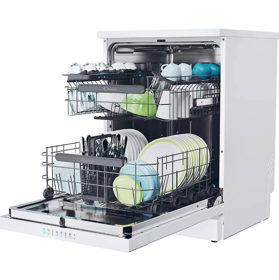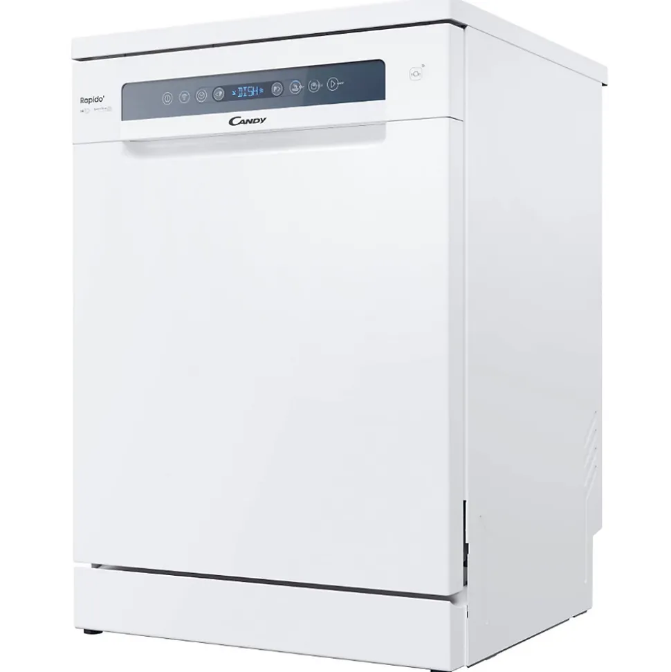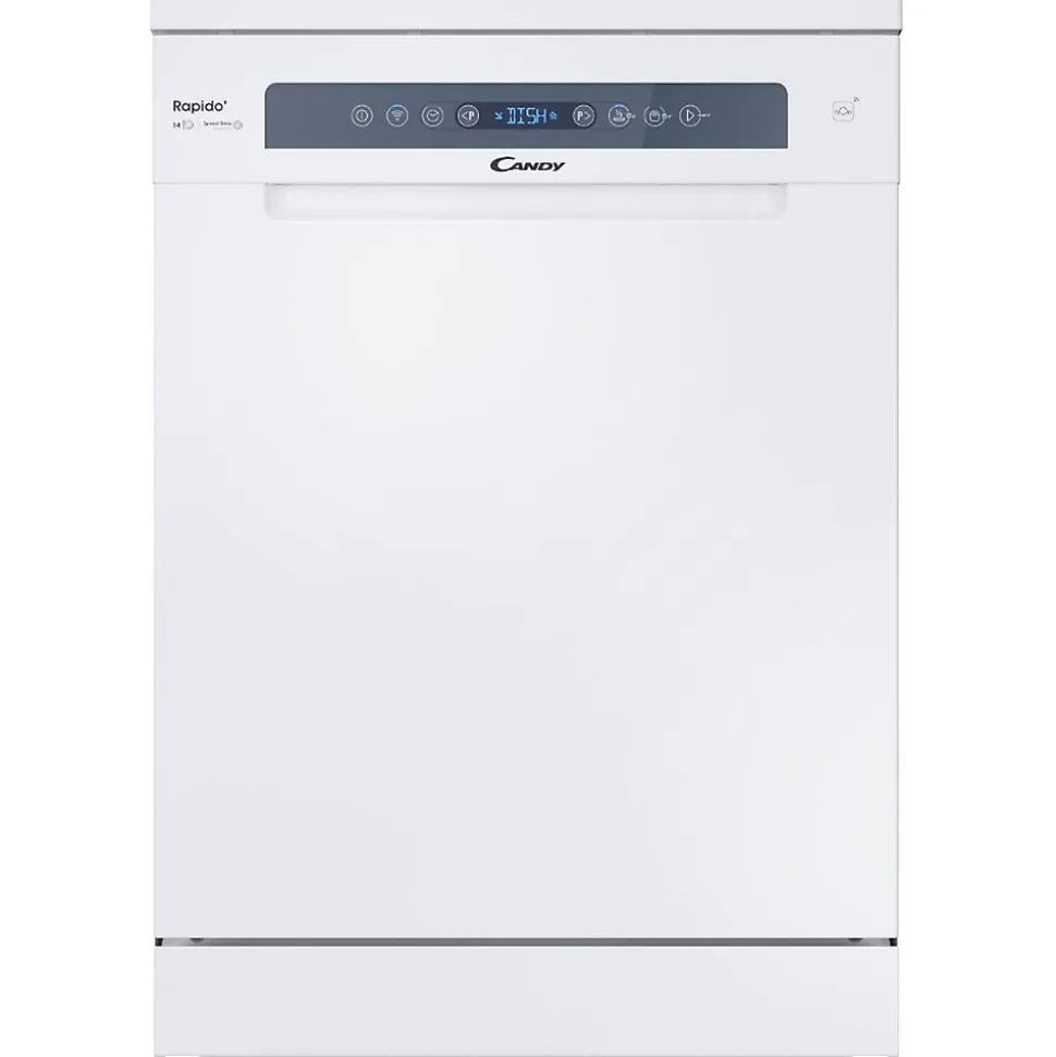 Lave-vaisselle pose libre Candy 14 couverts avec 8 programmes, dont Wash&Dry 35 min, connectivité Wi-Fi + Bluetooth, porte à ouverture automatique, moteur Speed-Drive Inverter, niveau sonore 44 dB, départ différé 1-23h.